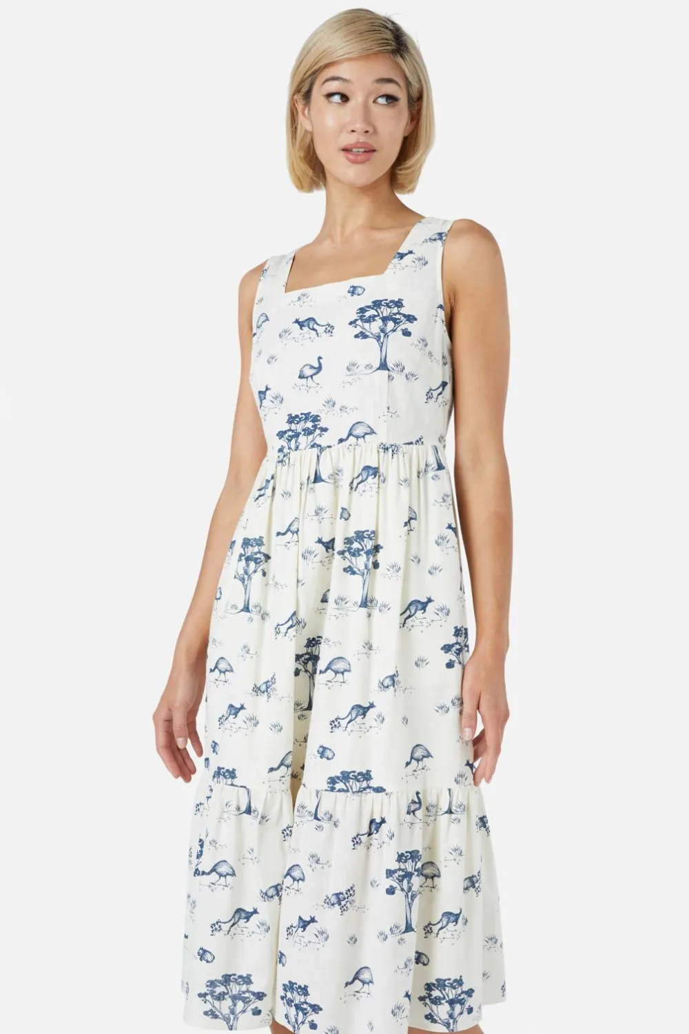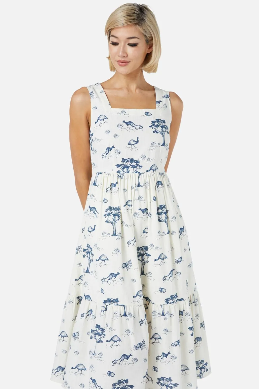 A charming tribute to the land Down Under, the Aus Toile Midi Dress features a delightful toile-style print of Australian animals, set against soft cotton in classic cream and blue. With timeless details and a breezy silhouette, it’s a dress made for warm days and whimsical wanderings.