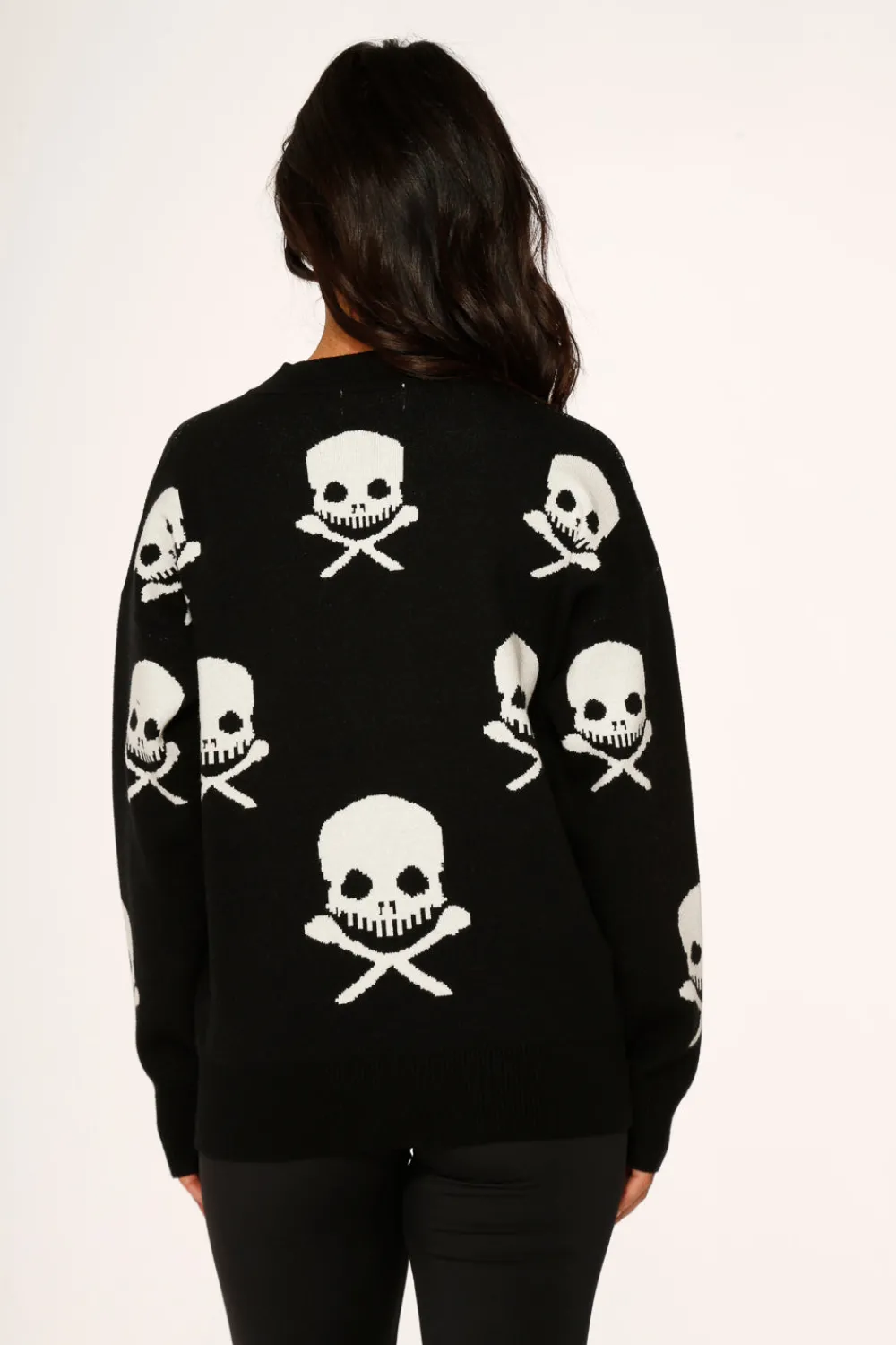 Add a little edge to your cozy with the Orchid Bloom Black Skulls Sweater! Featuring a bold allover skull print and crafted from a soft, stretchy blend, this sweater brings a playful dose of rebel spirit to your everyday look. Perfect for layering over dresses or pairing with your favorite jeans, it’s comfy, cool, and made for standing out.