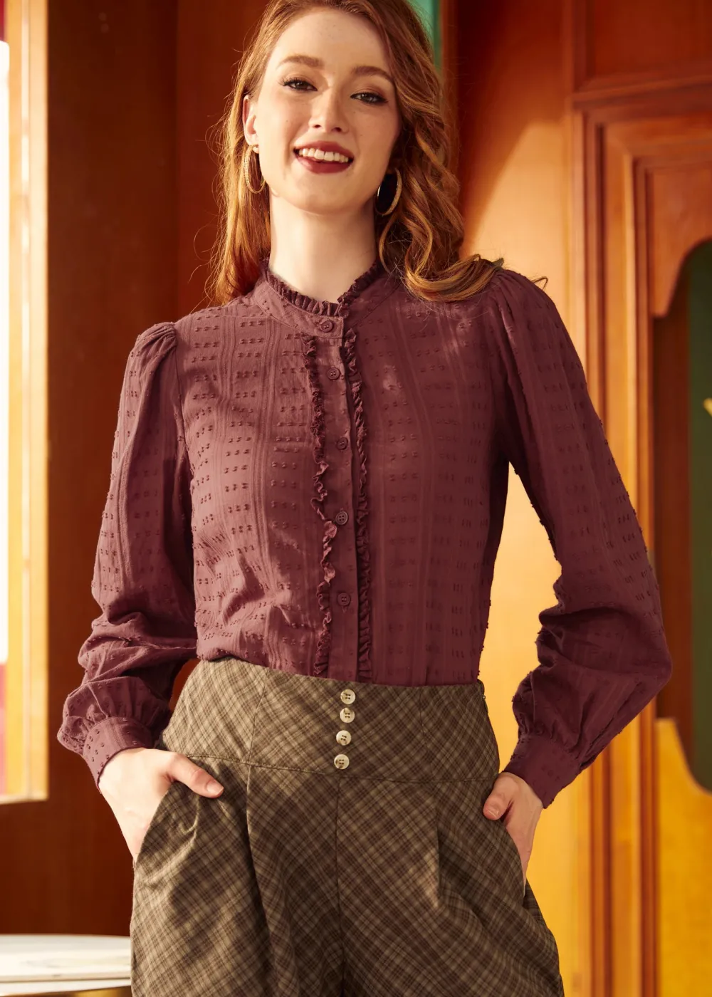 Twirl into fall with the Go-Go Girl Ruffle Blouse from our ModCloth namesake label in blushing blossom. This flirty, woven top showcases playful ruffles and functional buttons, offering a comfortable pull-over style. It’s perfect for a day at the office or a romantic evening out.