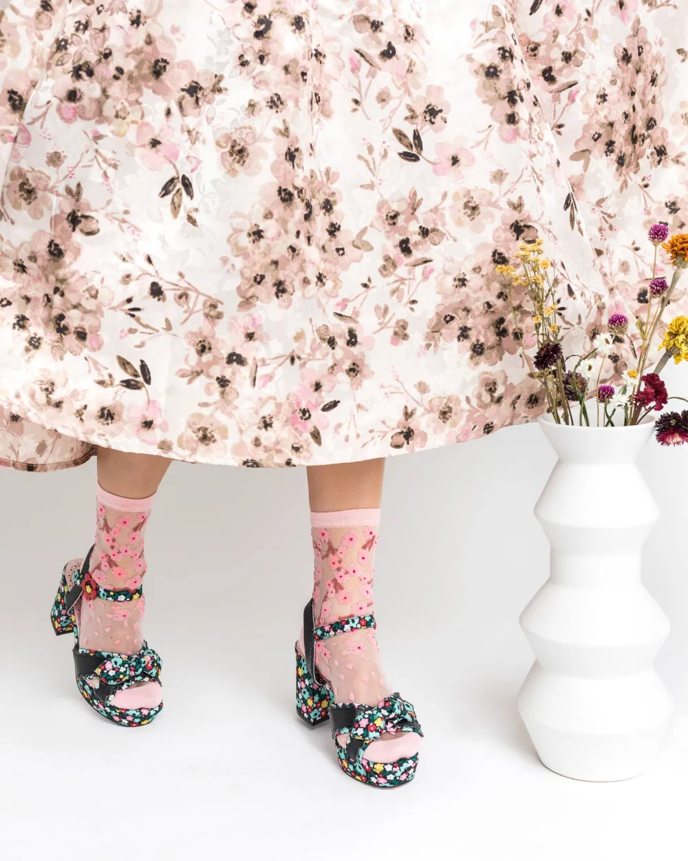 Nothing screams Spring like breathtaking cherry blossoms. This sheer flower sock features blooms on the ankle, with cherry blossom petals falling towards the toe. Pair with a floral skirt for a girly look. Also great for bachelorette parties and bridal!