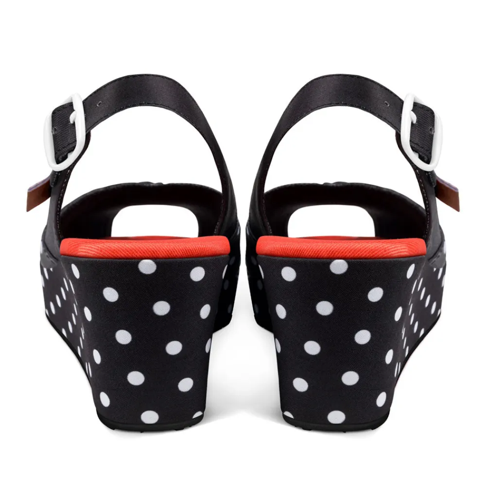 - Printed plasticupper. Printed fabric sides and wedge. Fabric inner.