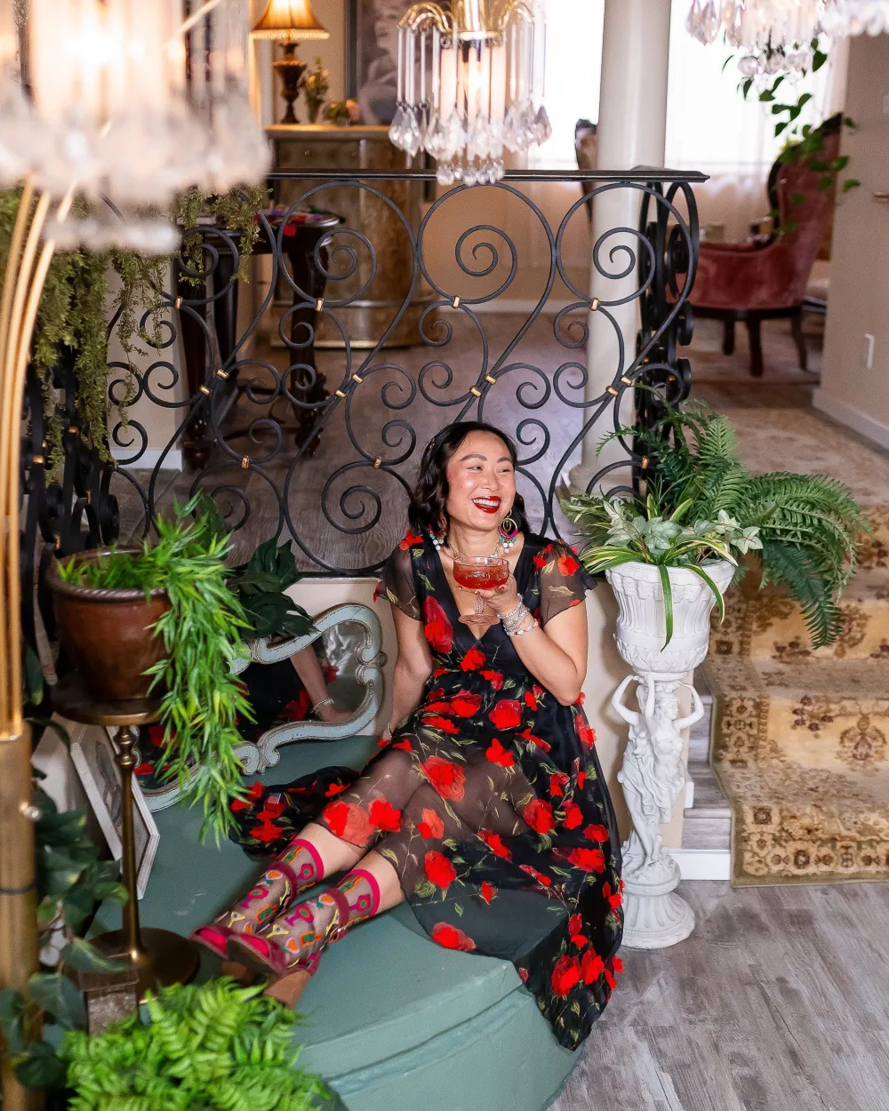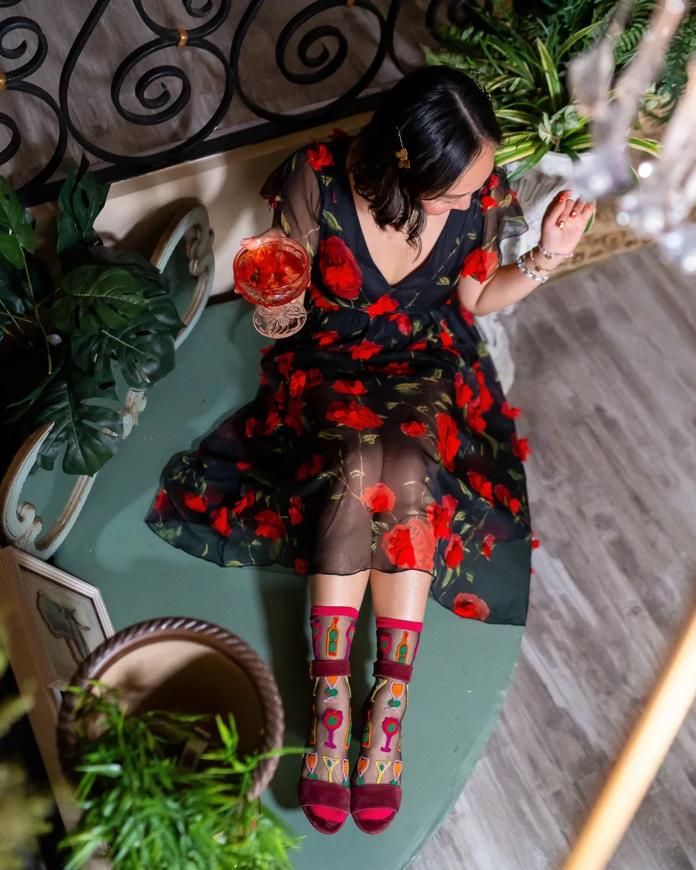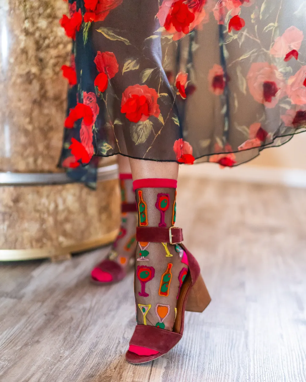 Our Cocktail Hour black sheer sock features wine glasses, martinis, and wine bottles with an unexpected olive twist. The graphic print and electrifying colors give this sock an art museum vibe, perfect for paint and sip nights with the girls. Finished with a mulberry colored cuff, heel, and toe for a sultry look.