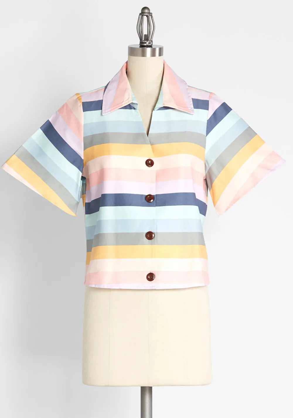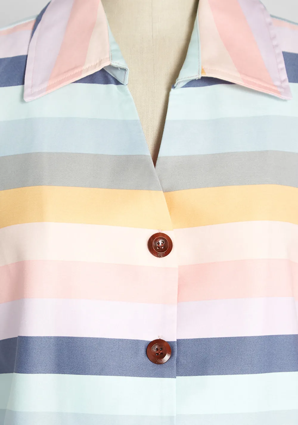In dreamy shades of summer sunsets, we bring you this cheerful and retro-chic striped button-up top from U.K. brand Bright and Beautiful. Made from a woven cotton-blend fabric with an adorable horizontal stripe pattern in pastel pinks, blues, purple, yellow and grey, this vintage-inspired shirt features wide short sleeves, an exaggerated point collar, retro-fab wooden button-front closure. So sweet and created with an easy fit that is great for tucking into high-rise jeans or a swing skirt, this darling short sleeved blouse will be a treat to mix and match with your favorite summer separates.