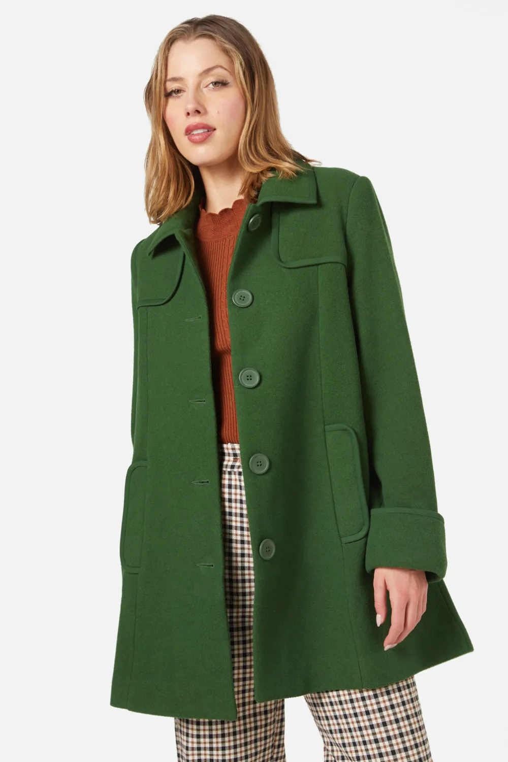 Janet Coat by Princess Highway: Add a pop of retro-inspired style to your wardrobe with the Janet Coat in vibrant green. This timeless piece features a slightly A-line cut, accentuated with matching binding detail along the edges for a vintage touch. With a button-down front, long sleeves, and practical front pockets, it’s both stylish and functional. Falling to mid-thigh, it’s the ideal length for layering over winter outfits. Crafted from a warm wool-polyester blend, this coat is a statement piece for chilly days.