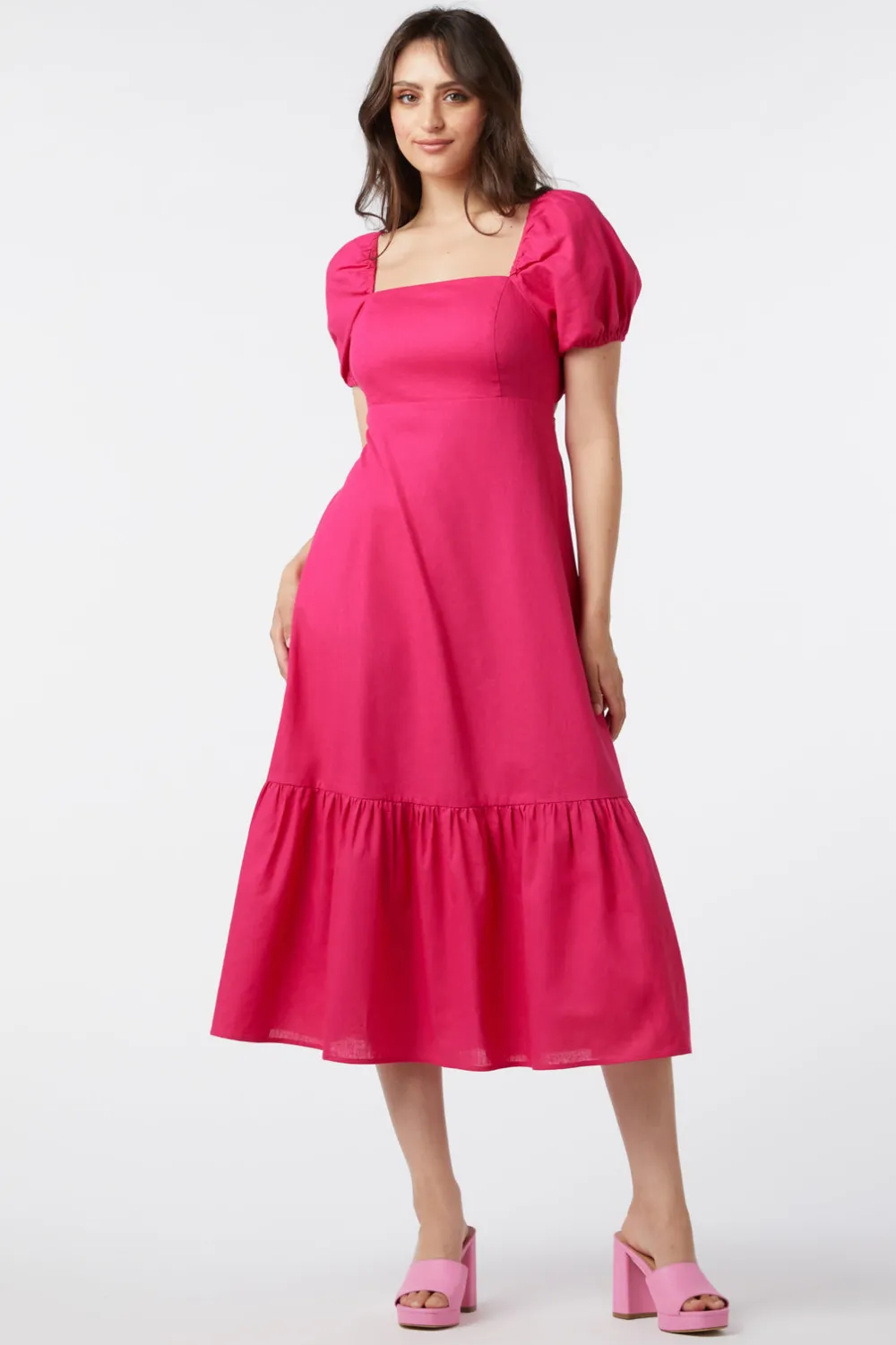 Step into the Ellery Midi Dress and let your day bloom into night with seamless elegance. It’s the wardrobe wonder you’ll reach for when sunny afternoons turn into candle-lit dinners without a moment to change. Crafted from a breezy blend of linen and cotton, the Ellery whispers sweet nothings to your skin while keeping you chic. The fitted bodice, adorned with a charming back bow, brings a hint of romance to your look, paired with short puff sleeves that boast elastic shoulders for a slip-free embrace. With its cinched waist and skirt that elegantly drapes below the knee, this dress articulates grace in motion, culminating in a deep ruffle that flirts with every footstep.