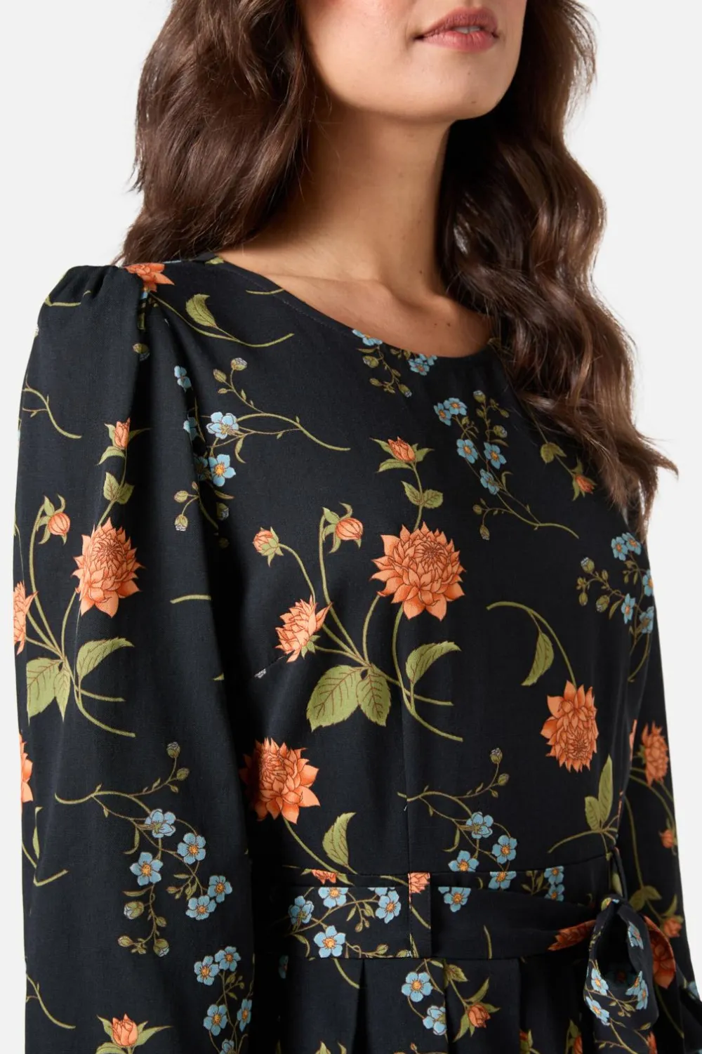 Step into 70s glamour with the Esmerelda Floral Mini Dress by Princess Highway. This black long-sleeve mini is adorned with a dreamy, flowing floral print that channels romance, elegance, and a touch of retro mystique. The semi-fitted bodice and soft pleated skirt create a flattering silhouette, while the detachable waist tie lets you cinch things up or keep it relaxed.