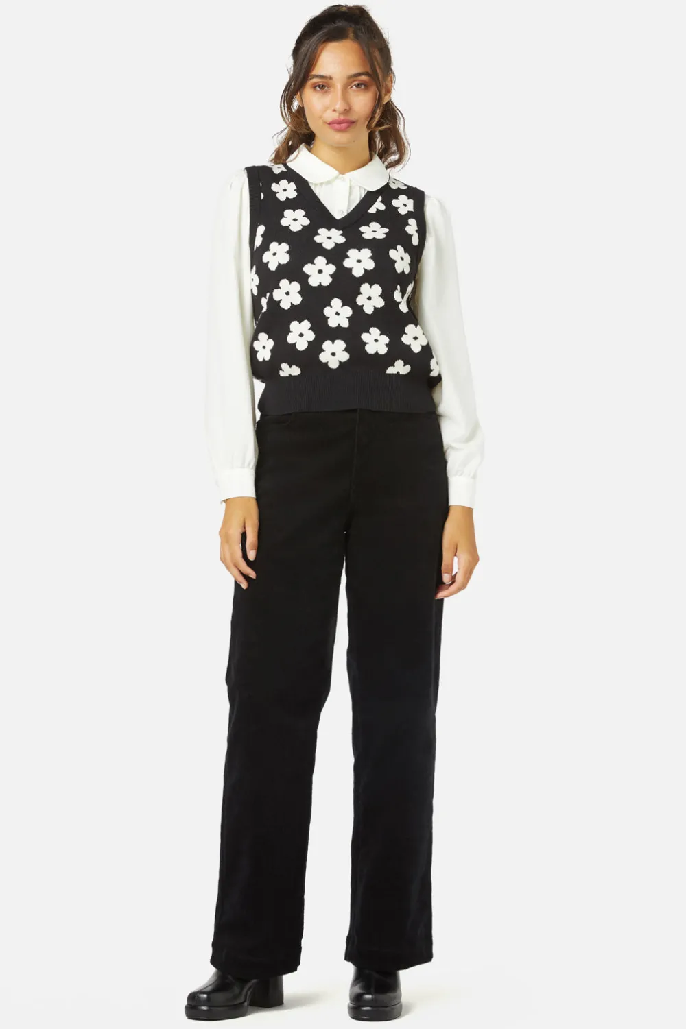 The Daisy Knitted Vest from Princess Highway is a delightful nod to ’60s charm, cloaked in wearable nostalgia. It’s the kind of garment that hums a tune of casual ease while still whispering a tale of retro cool. The vest flourishes with a minimalist daisy print, radiating cuteness and an irresistible grooviness that will surely put a pep in your step. This semi-fitted wonder offers generous stretch, ensuring you can twist and jive through your day with uncompromised ease. The V-neckline shaping gives a subtle nod to classic lines, framing the face and layering beautifully over your favorite shirts. Crafted from soft cotton yarn, it’s like slipping into a gentle hug that keeps the chill at bay. Available in an ever-adaptable black, this vest is your go-to for adding a dash of fun to office attire or spicing up a weekend ensemble.