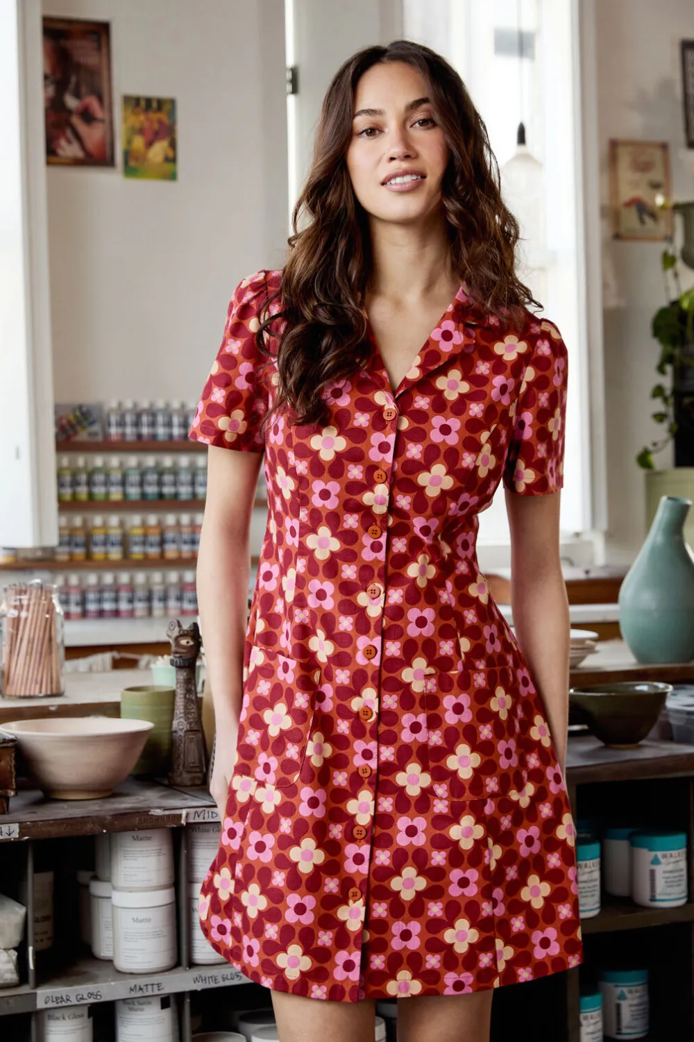 Step into a time capsule of mod style with the Ginny 60s Shirt by Princess Highway. This rust orange and pink shirt features a bold geometric floral print inspired by classic mid-century wallpaper designs. With its relaxed fit, pointed collar, and curved hem, it’s the perfect blend of vintage charm and everyday comfort.