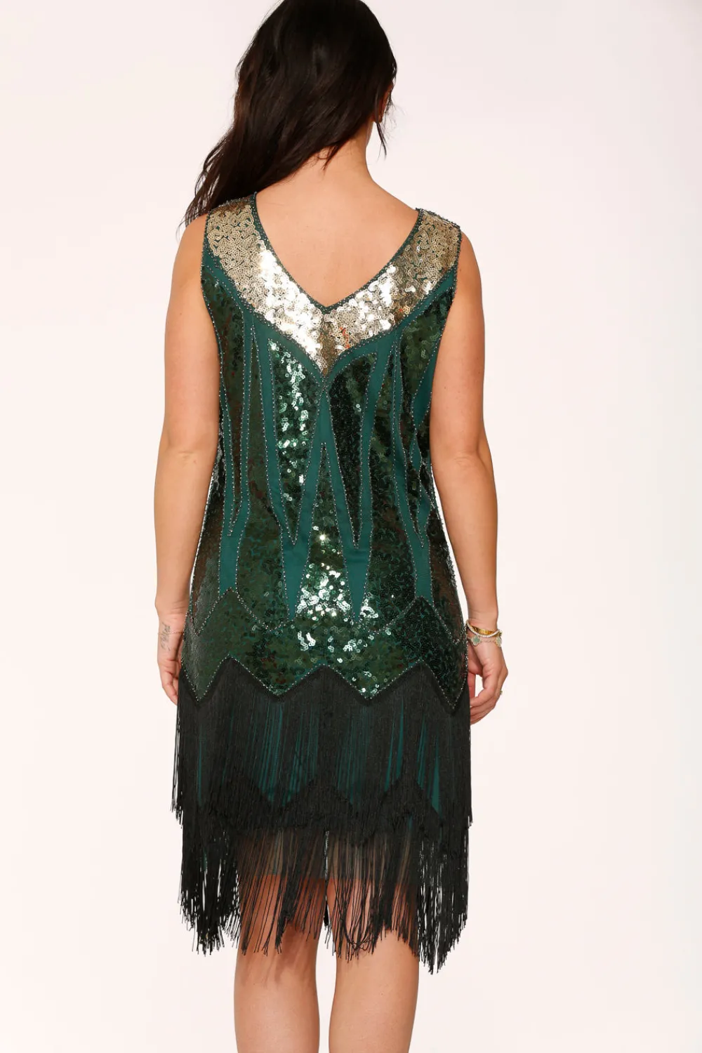 Light up the dance floor in this radiant emerald green flapper dress by Orchid Bloom. Featuring shimmering sequins, a gold-accented neckline, and layered fringe for playful movement, this vintage-inspired piece brings Gatsby glam to any celebration.