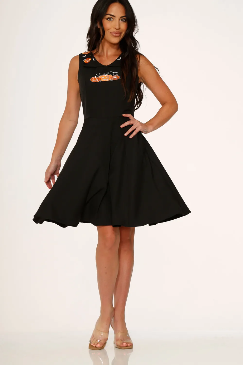 Get ready to carve out some serious style this spooky season with the Orchid Bloom Halloween Pumpkin Embroidery Swing Dress! This playful yet sophisticated piece features adorable pumpkin embroidery details on the collar and chest, bringing a touch of Halloween spirit to your look. The classic fit-and-flare silhouette is crafted from a comfortable cotton-spandex blend that moves effortlessly with you, while the center back zipper ensures a sleek fit. Perfect for Halloween parties, pumpkin patch adventures, or just showing off your spooky spirit all season long!