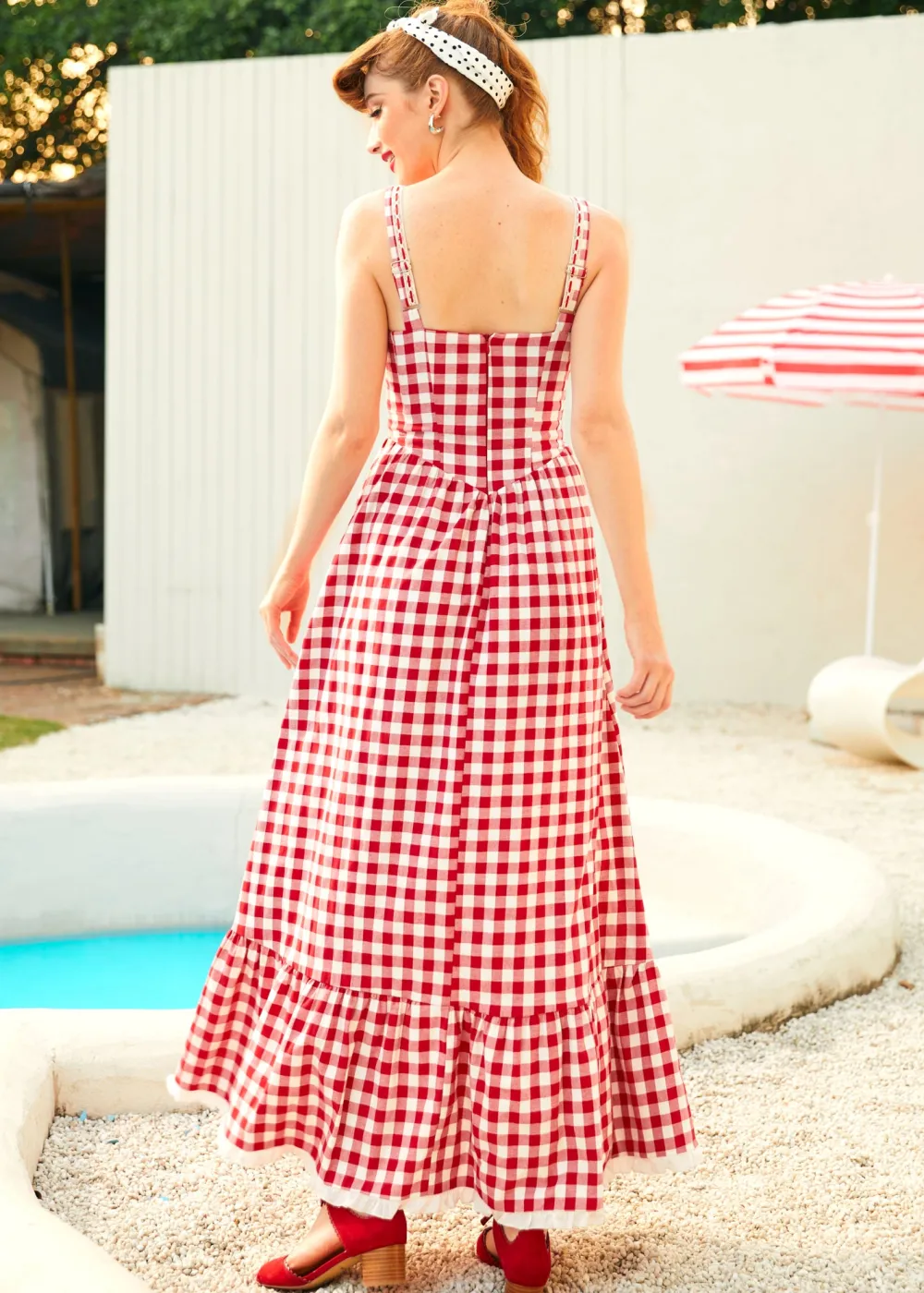 Jam Gingham Corset Dress by Dangerfield – A vintage-inspired red gingham dress with a romantic corset-style bodice and soft, flowing skirt.