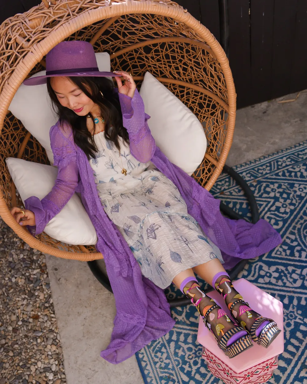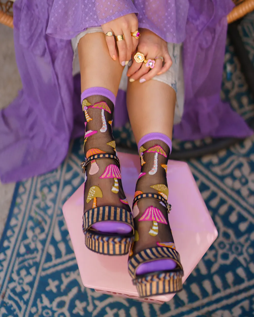We don’t want to brag, but these are the cutest mushrooms you’ll ever wear on your feet. Channel your inner boho queen and add a dash of whimsy to your look with our mushroom socks, set against a black sheer fabric for a mysterious vibe.