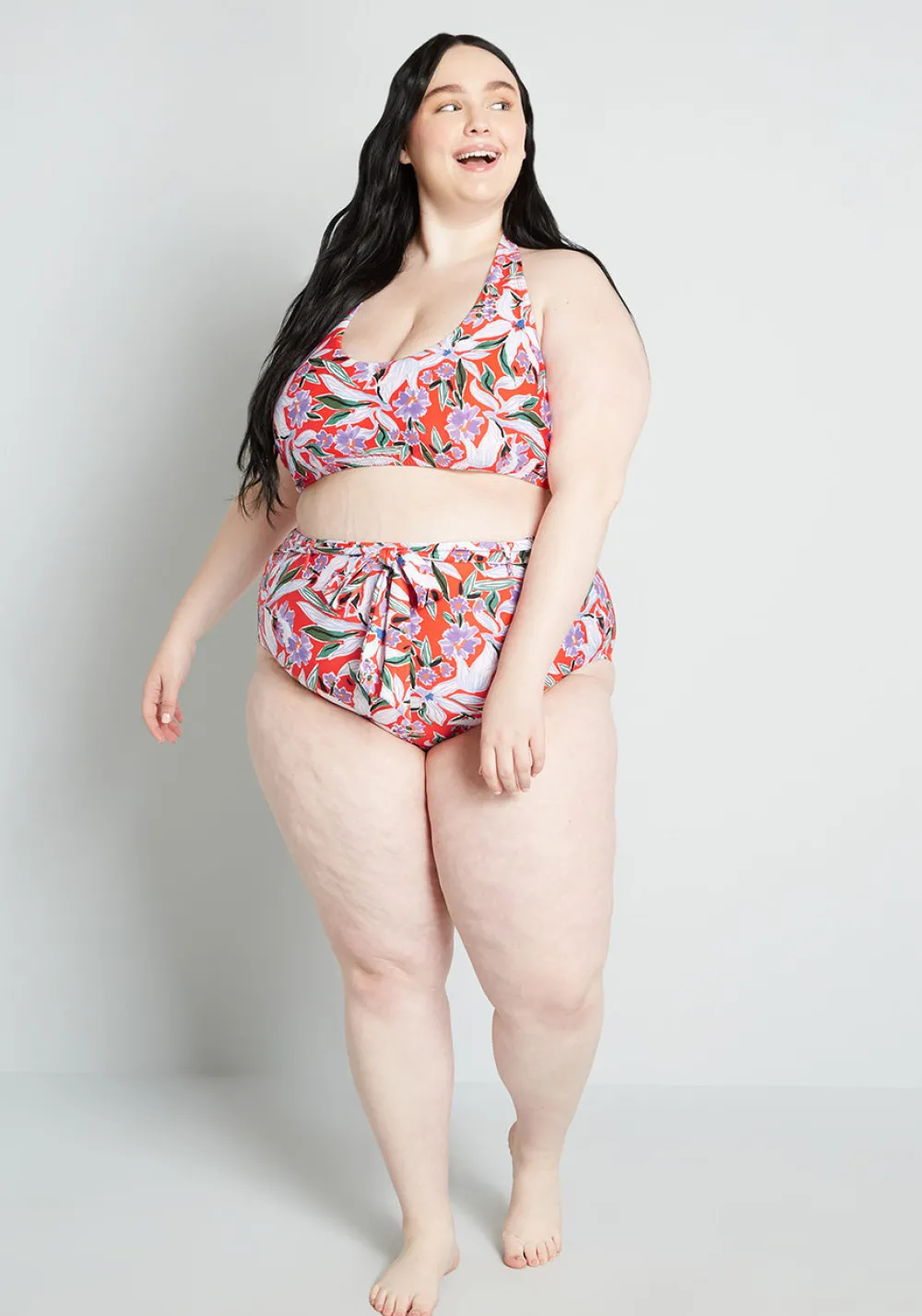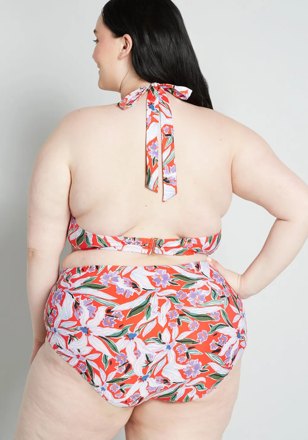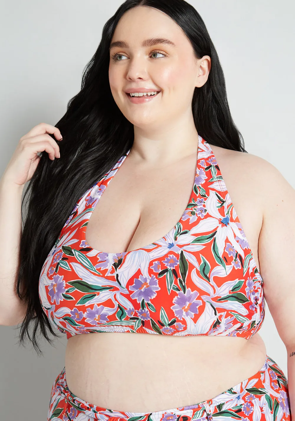 Secure your sunnies and step into the water with this floral print halter top by our ModCloth exclusive label. Featuring an orange, emerald, and lilac floral print hand-drawn in house, this swim top is made with an adjustable back with a hook closure for added support. Frolick freely with a fully lined construction and removable bust cups for made-for-you comfort. The sun is out for this style, so get swimmin’ and shinin’.