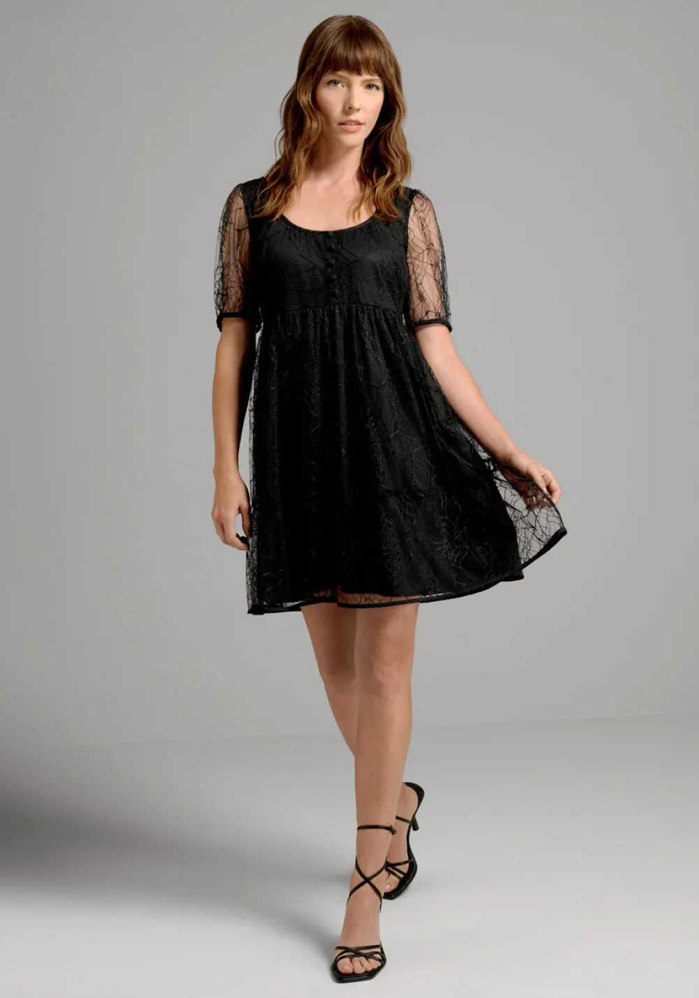 You’re cute-yet-creepy in this gorgeous black babydoll dress from our ModCloth namesake label! Made from an exclusive woven mesh lace with a hauntingly beautiful spider web design, this adorable Halloween-themed dress is fully-lined except at the sheer, elbow-length sleeves and boasts a scoop neckline, decorative buttons at the bust, a retro-chic empire waist, an above-the-knee skirt, and a stylish relaxed-fit silhouette.