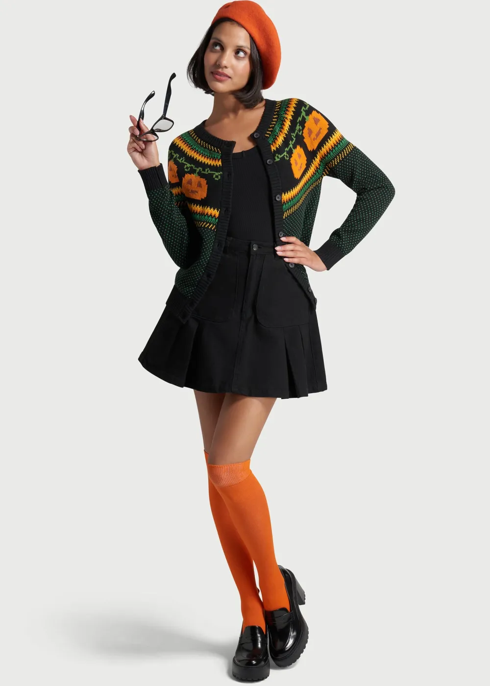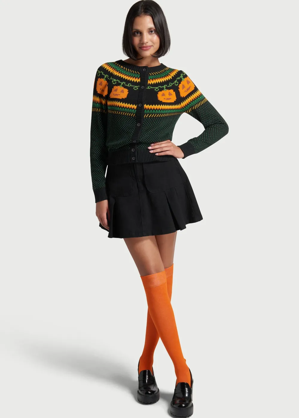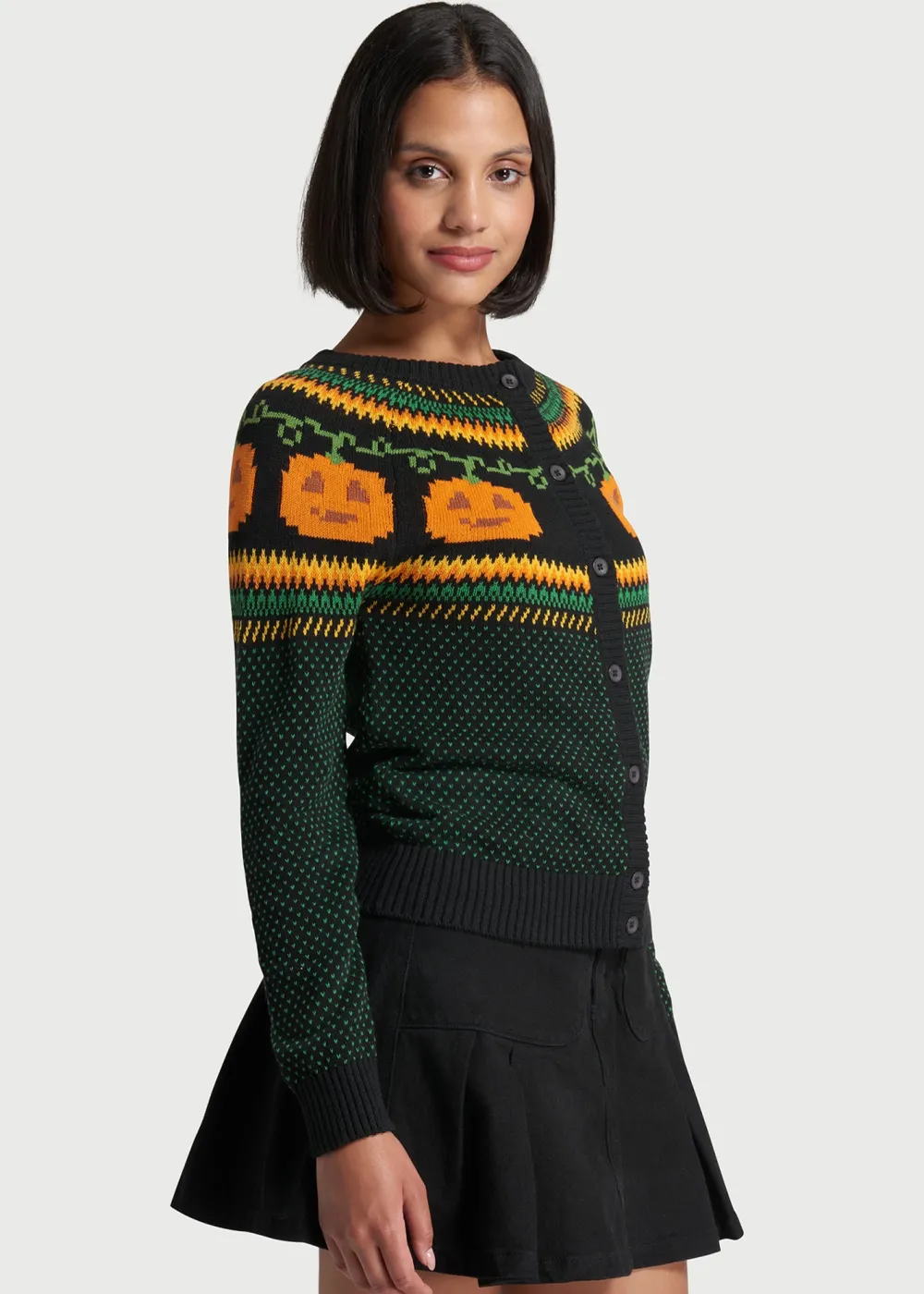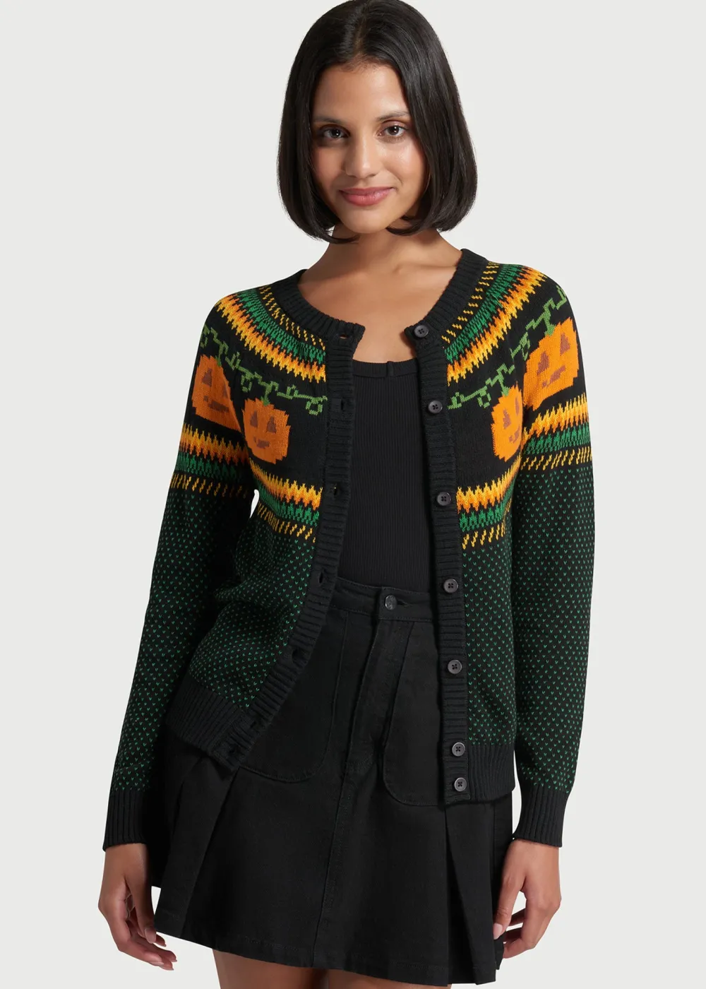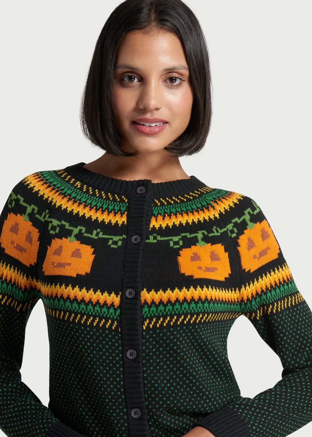 Get into the festive spirit with this black cardigan sweater from our ModCloth namesake label! The quirky, exclusive Fair Isle pattern at the yoke features orange Jack-o-lantern motifs that are framed by orange, yellow, and green zig-zags, along with miniature polka-dots scattered all over. Made from a super soft cotton knit, this ‘gord-geous’ button-up sweater will be a unique layer to add to your ensembles all year round.