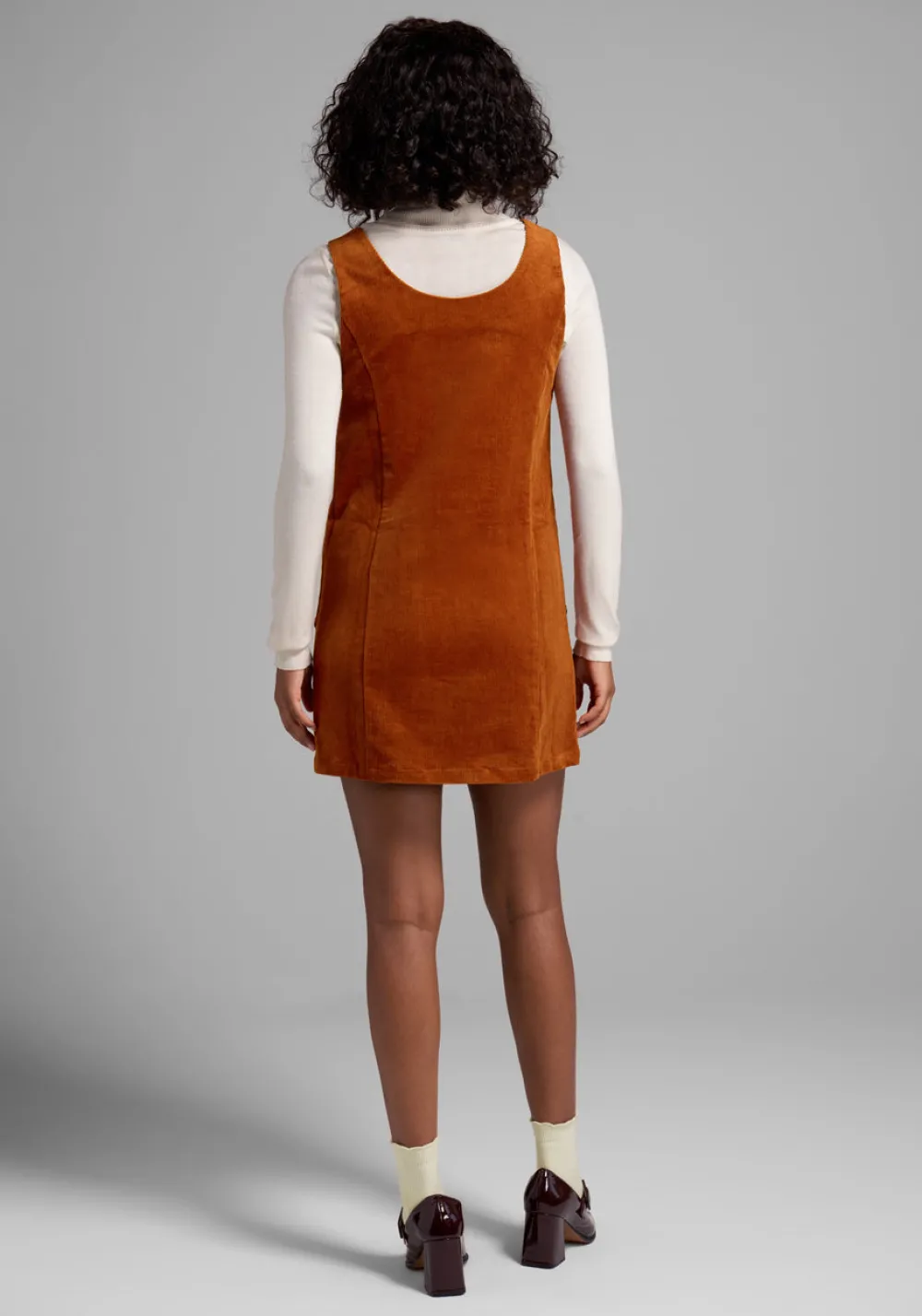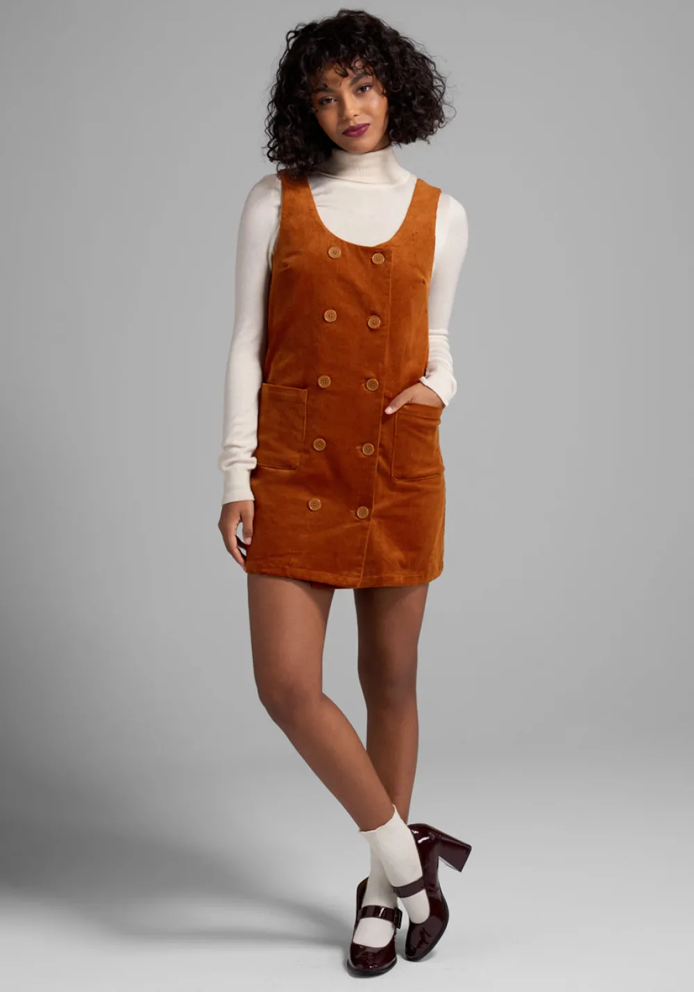You certainly know how to play your fall fashion to the note in this cinnamon-hued corduroy jumper from our ModCloth namesake label! Made from a slightly stretchy cotton corduroy, this sleeveless pinafore jumper is elevated by double-breasted front button closure and boasts front patch pockets, a coquettish A-line silhouette, and an above-the-knee finish. So perfect for warm layering during colder months, this 70’s-inspired rust jumper looks great over a turtleneck and tights, a t-shirt and sneakers, and it can even be styled alone when things start to warm up.
