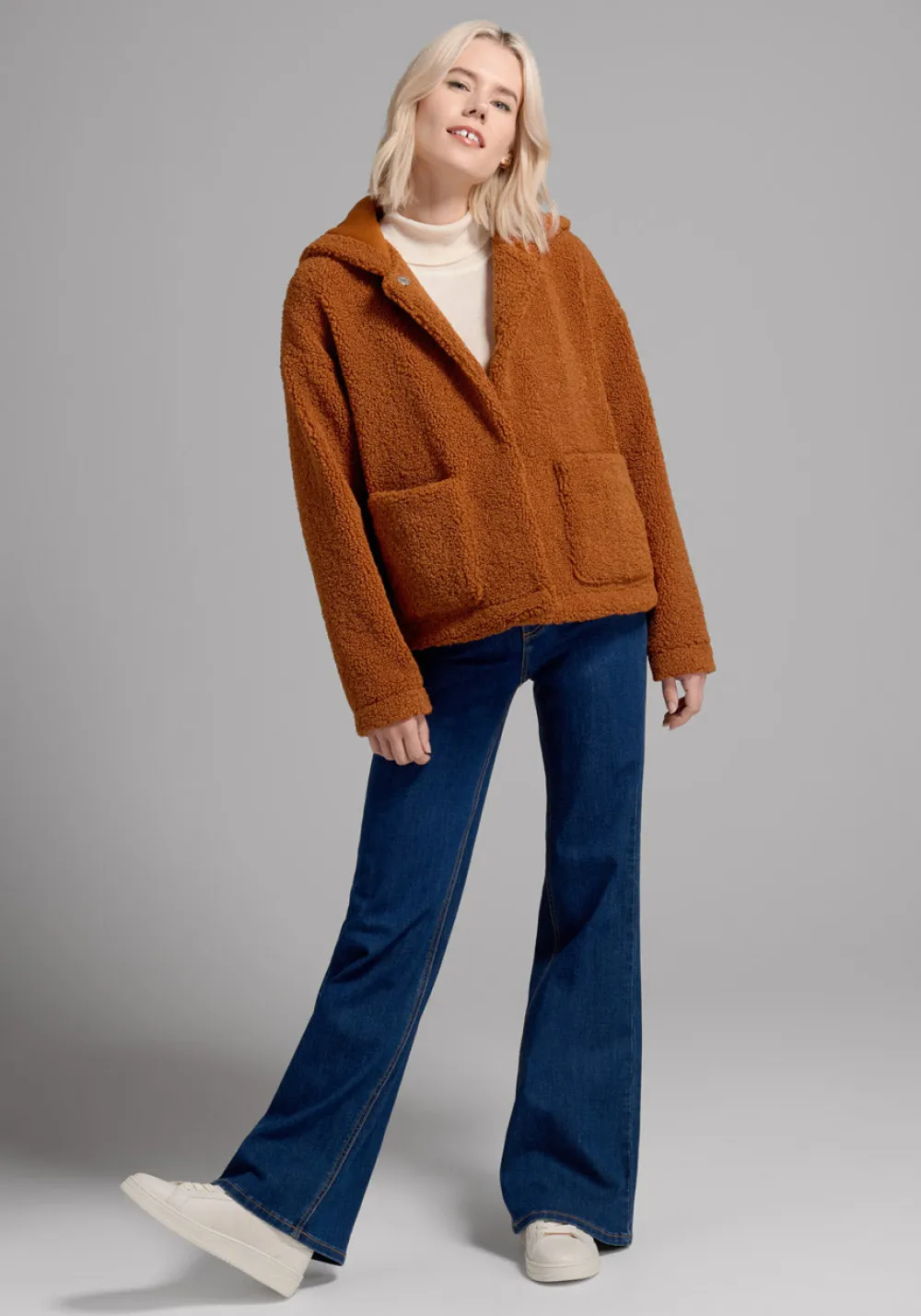 In a cinnamon-y shade of orange, this oh-so-cozy hooded jacket will keep you bundled up in retro-chic style! Made from a plush sherpa fabric and boasting front snap-button closure, handy front patch pockets, long sleeves, and a snuggly hood, this adorable, fully-lined teddy coat will become the outerwear you never want to take off.