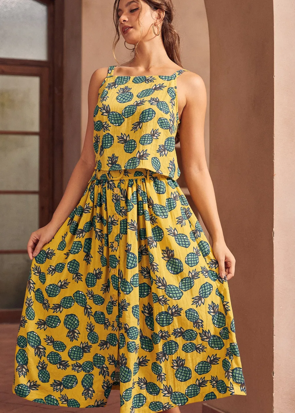 Dive into summer’s sweet embrace with this playful pineapple print tank top from our ModCloth namesake label. Crafted from breezy fabric, it’s a homage to sun-drenched days and balmy nights. The slender spaghetti straps offer a delicate touch while ensuring comfort, and at the back, a row of buttons adds a dash of unexpected charm.
