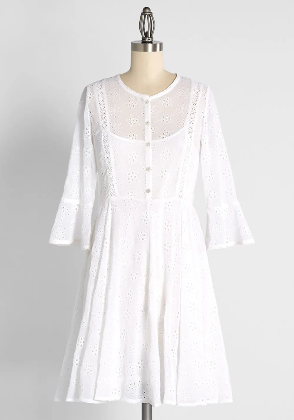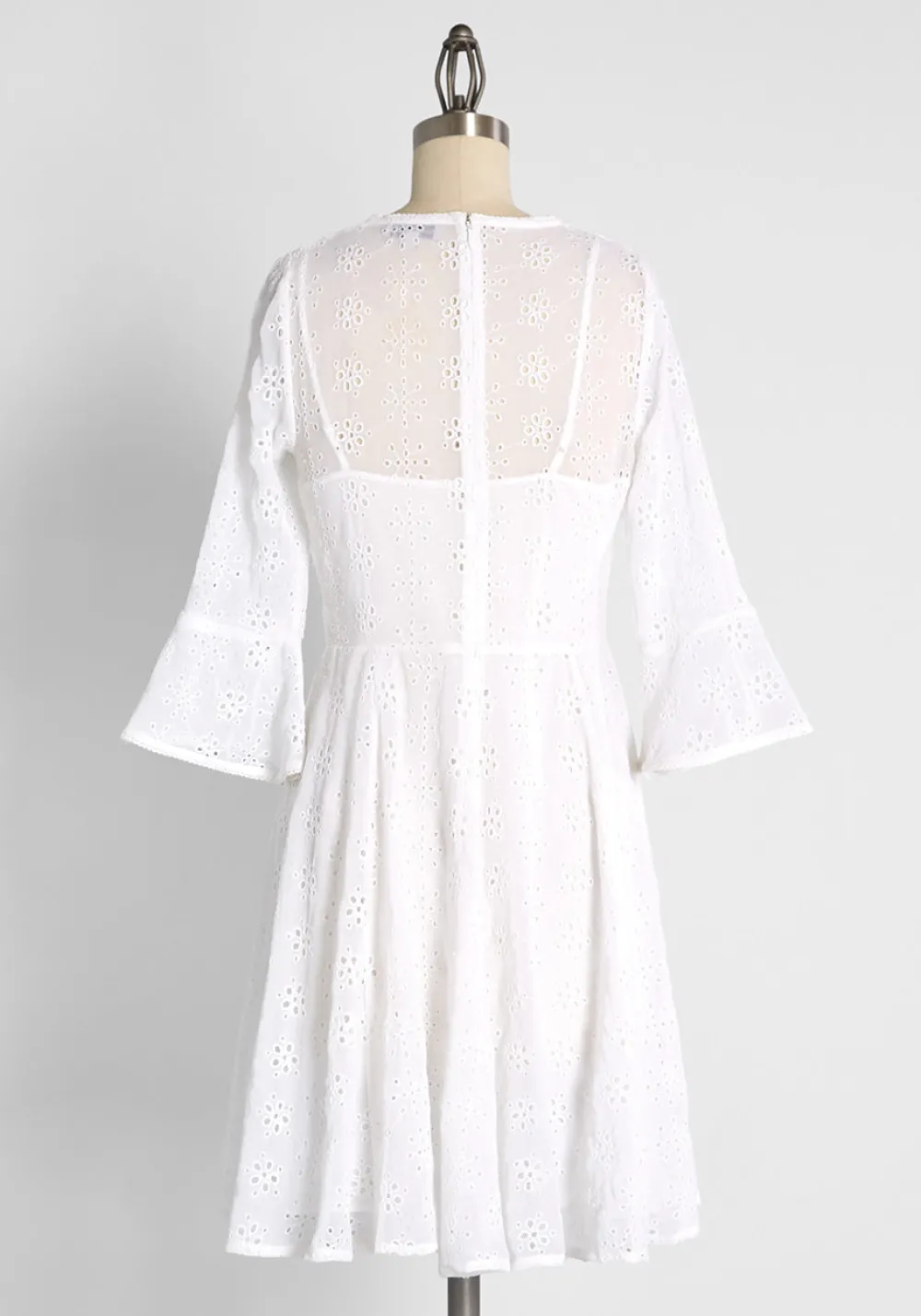 Meadow bound mavens and field searching starlets, turn your compass to this white eyelet mini dress by Amelia Rose to set your aesthetic free. Made of a crisp cool cotton, this mini dress is designed with a slip underneath, a placket of dainty buttons down the bodice, and a light-as-air bell sleeve with a slight flounce. Featuring an eyelet motif pattern all over and crocheted trim, this fresh summer dress is easily styled with neutral espadrilles or sandals.