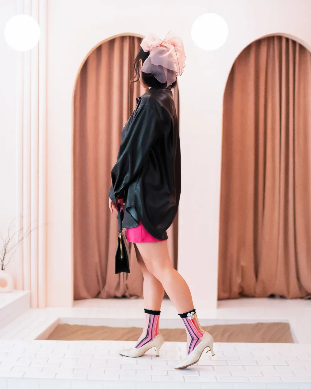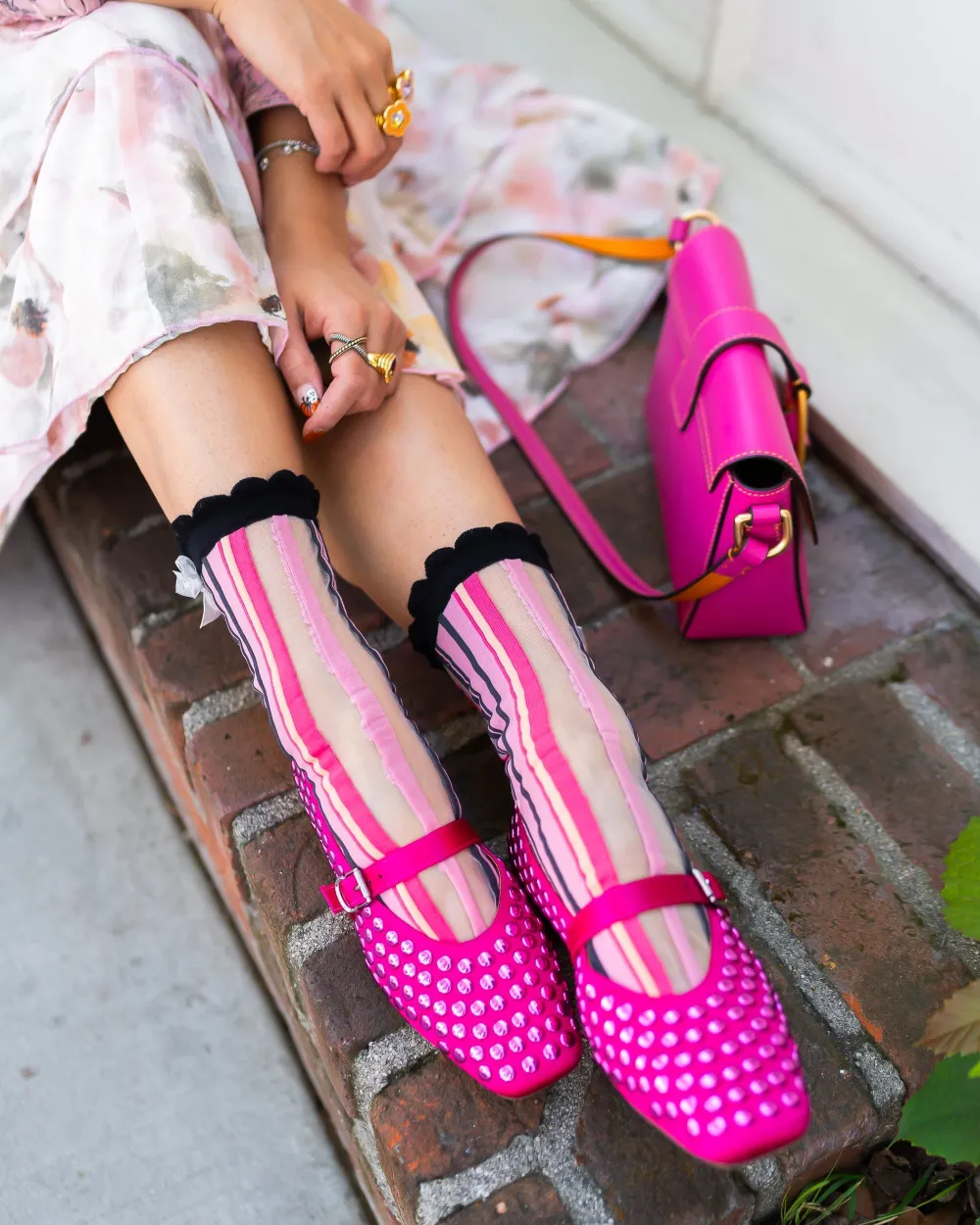Inspired by quintessential French girl style, our Parisian Stripes sock features classic pink, black and sheer stripes adorned with a sheer white bow and black ruffle cuff. We chose black and nude for the toe and heel for the perfect timeless touch. You’ll feel like you’re in Paris in no time when paired with pointy pumps and a hair bow.
