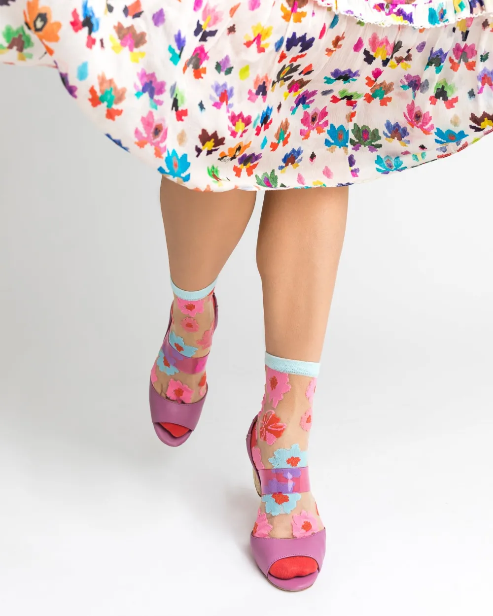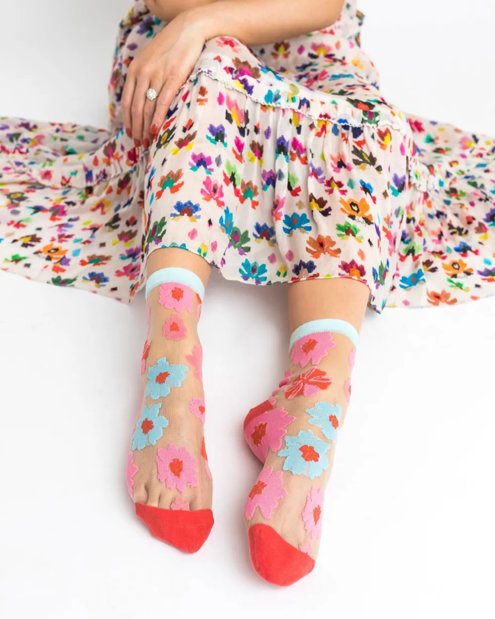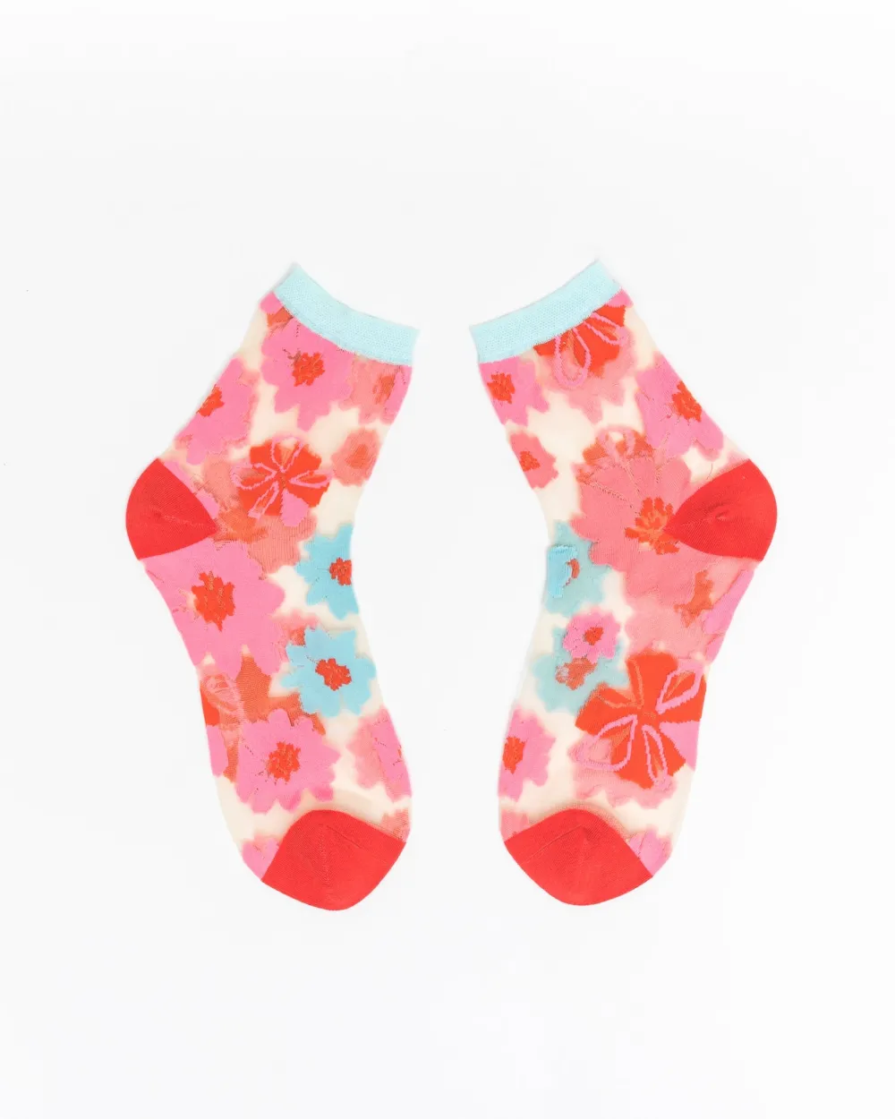 A fresh and playful take on florals, ribbon roses in pink, blue, and red adorn the feet with nude sheer fabric. This ankle length floral sock is great to pair with sandals, flats, and sneakers for a cute casual look.