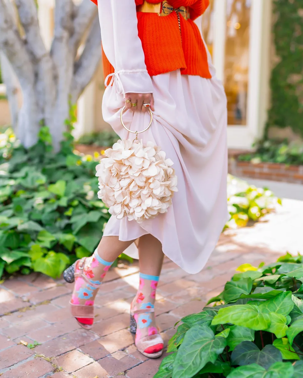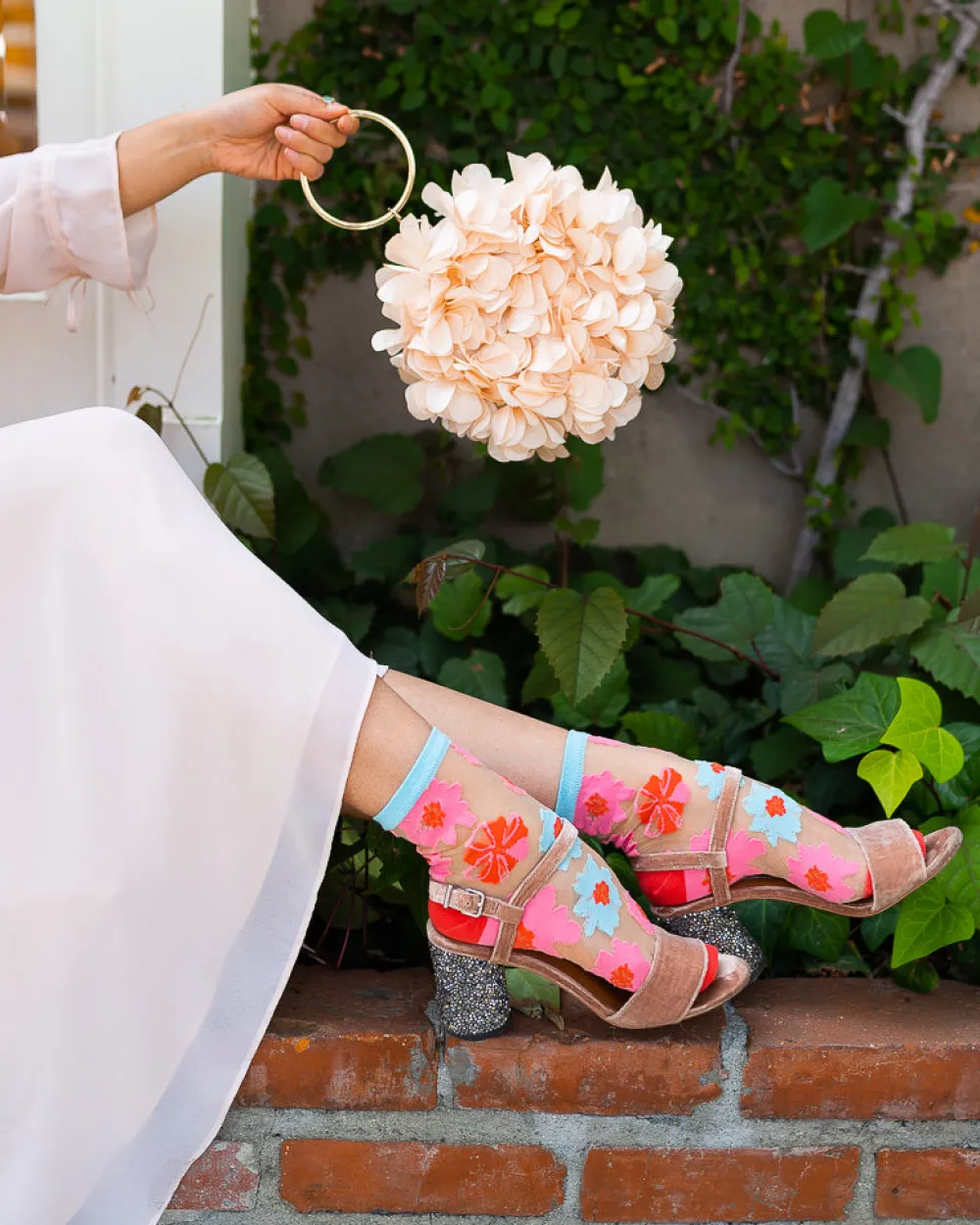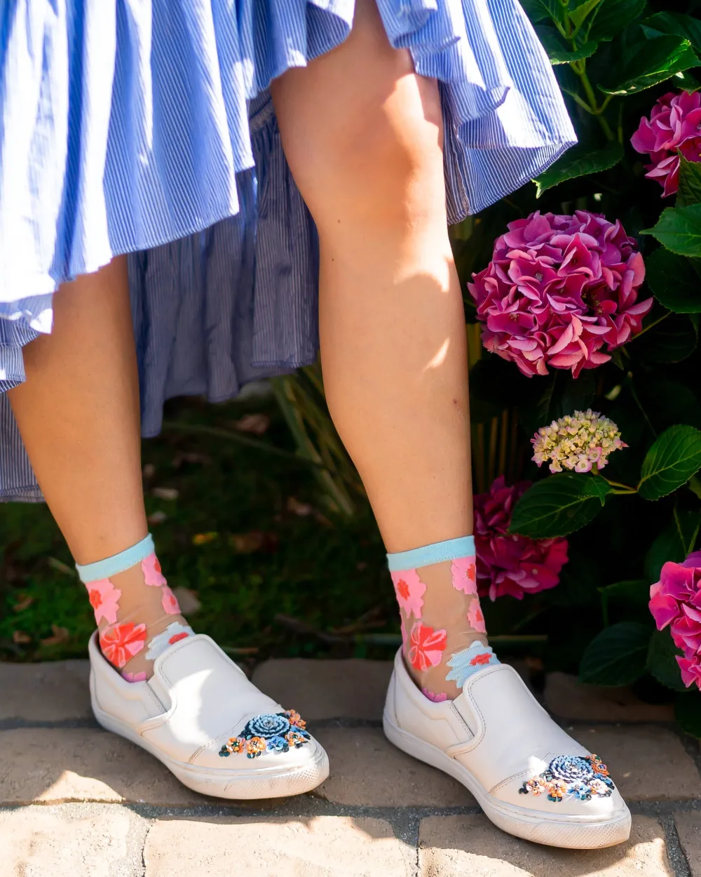 A fresh and playful take on florals, ribbon roses in pink, blue, and red adorn the feet with nude sheer fabric. This ankle length floral sock is great to pair with sandals, flats, and sneakers for a cute casual look.