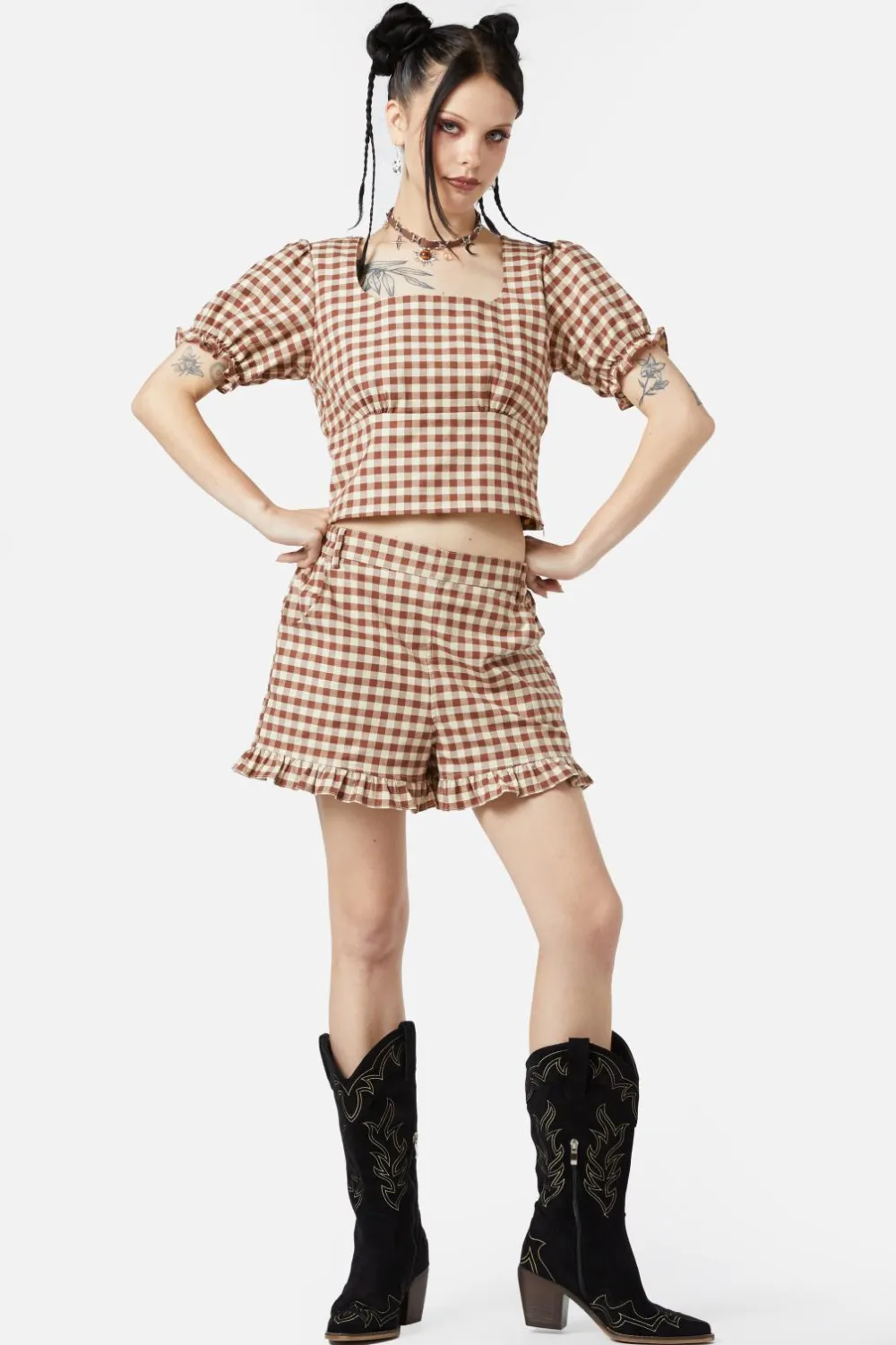 Saloon Gingham Shorts by Black Friday – A playful cream and brown gingham mini short, blending vintage charm with everyday comfort.