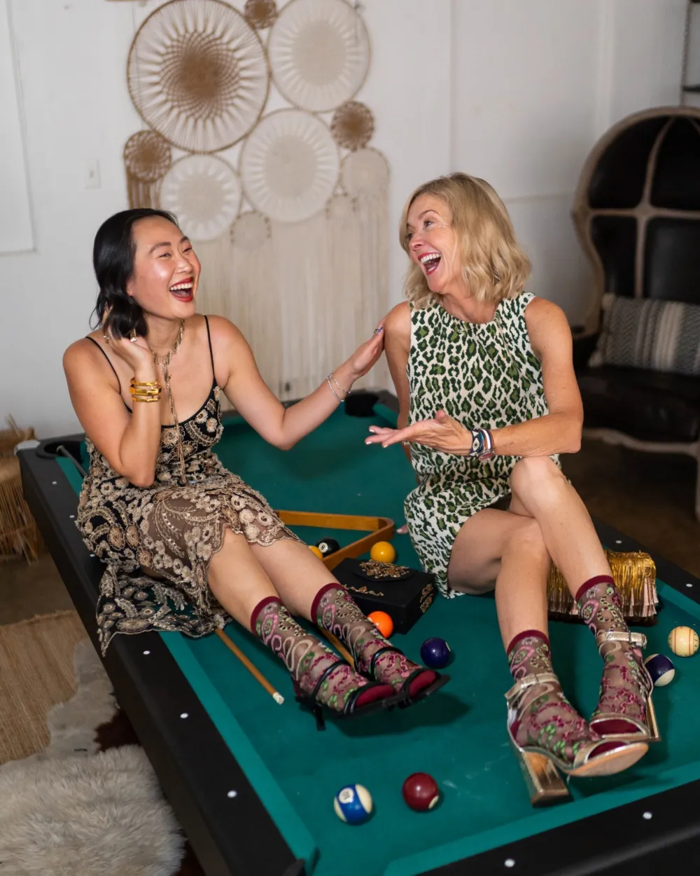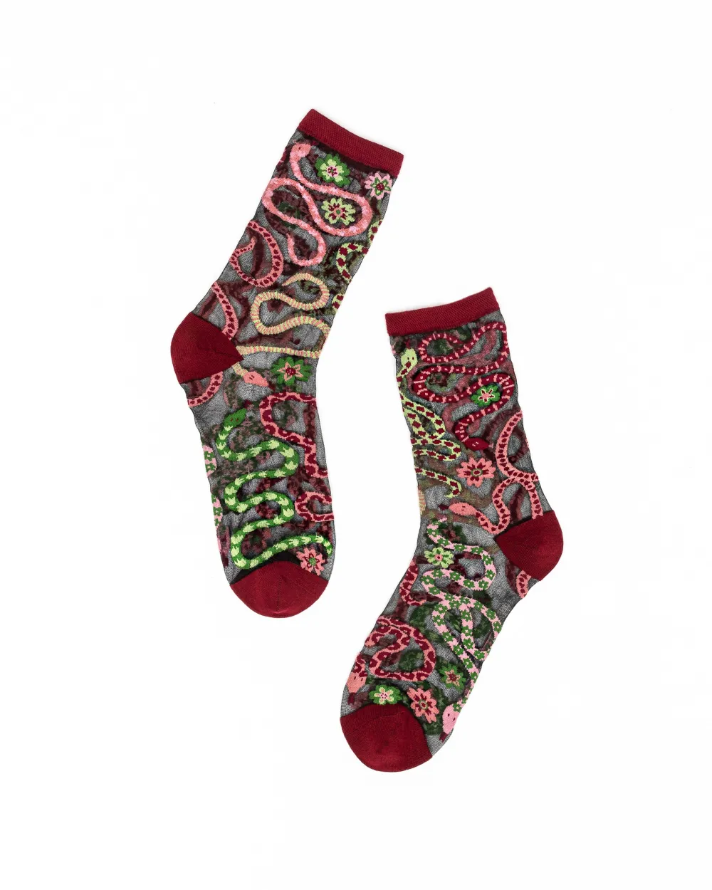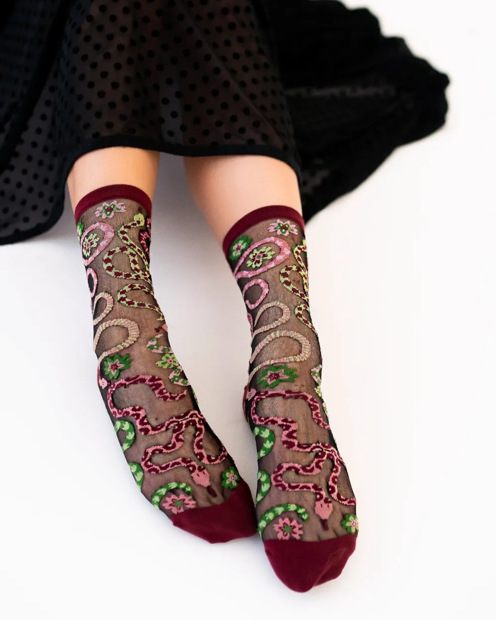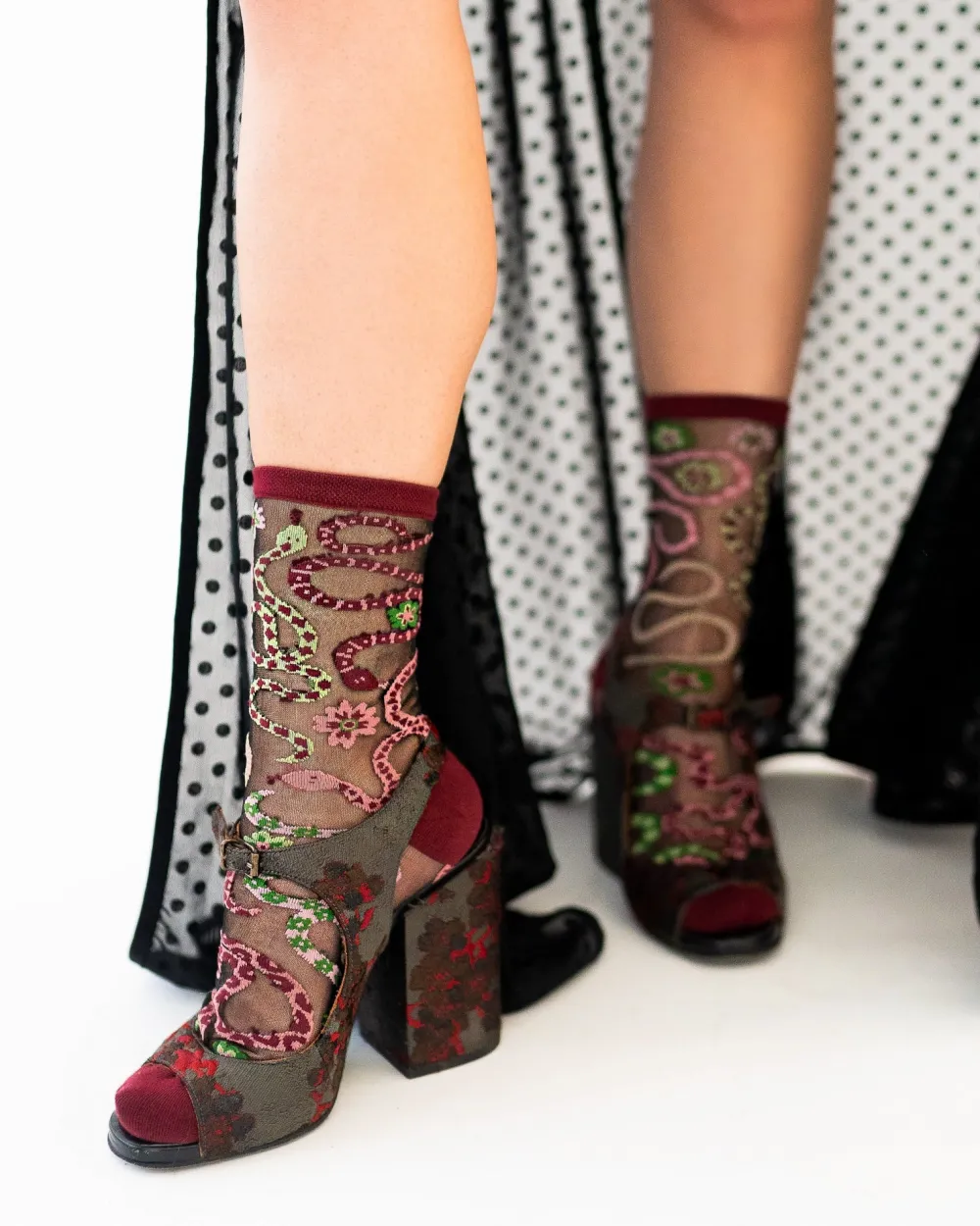 Something witchy this way comes with our serpentine print black sheer sock, inspired by a striking textile traditionally used in interior design. Dusty pink, burgundy and green snakes slither their way up the feet for a sultry vibe, while vintage florals add a feminine touch. This sock completes your Winter wardrobe for fancy nights out, and transitions seamlessly from day to night.