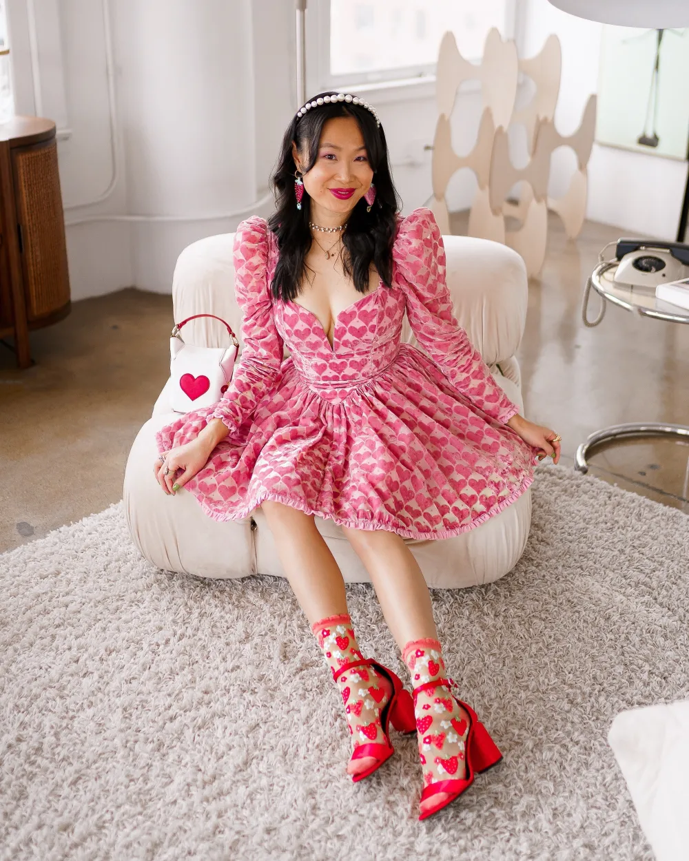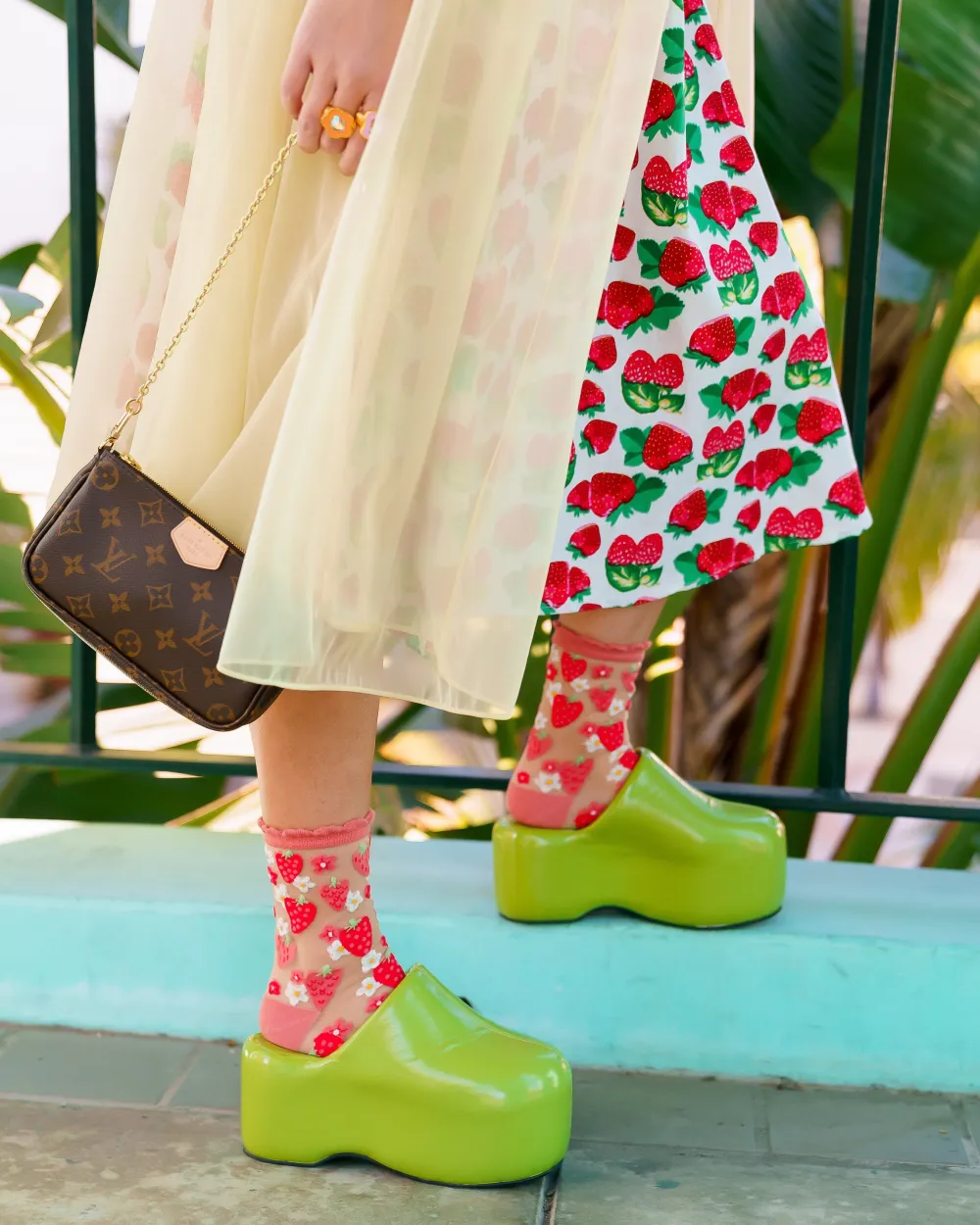 Heart-shaped pink and red strawberries interspersed with playful daisies make these strawberry socks the perfect addition to your Valentine’s Day, Spring, and Summer outfits. Set against white sheer fabric for maximum color pop with a ruffle cuff for ultra sweetness.