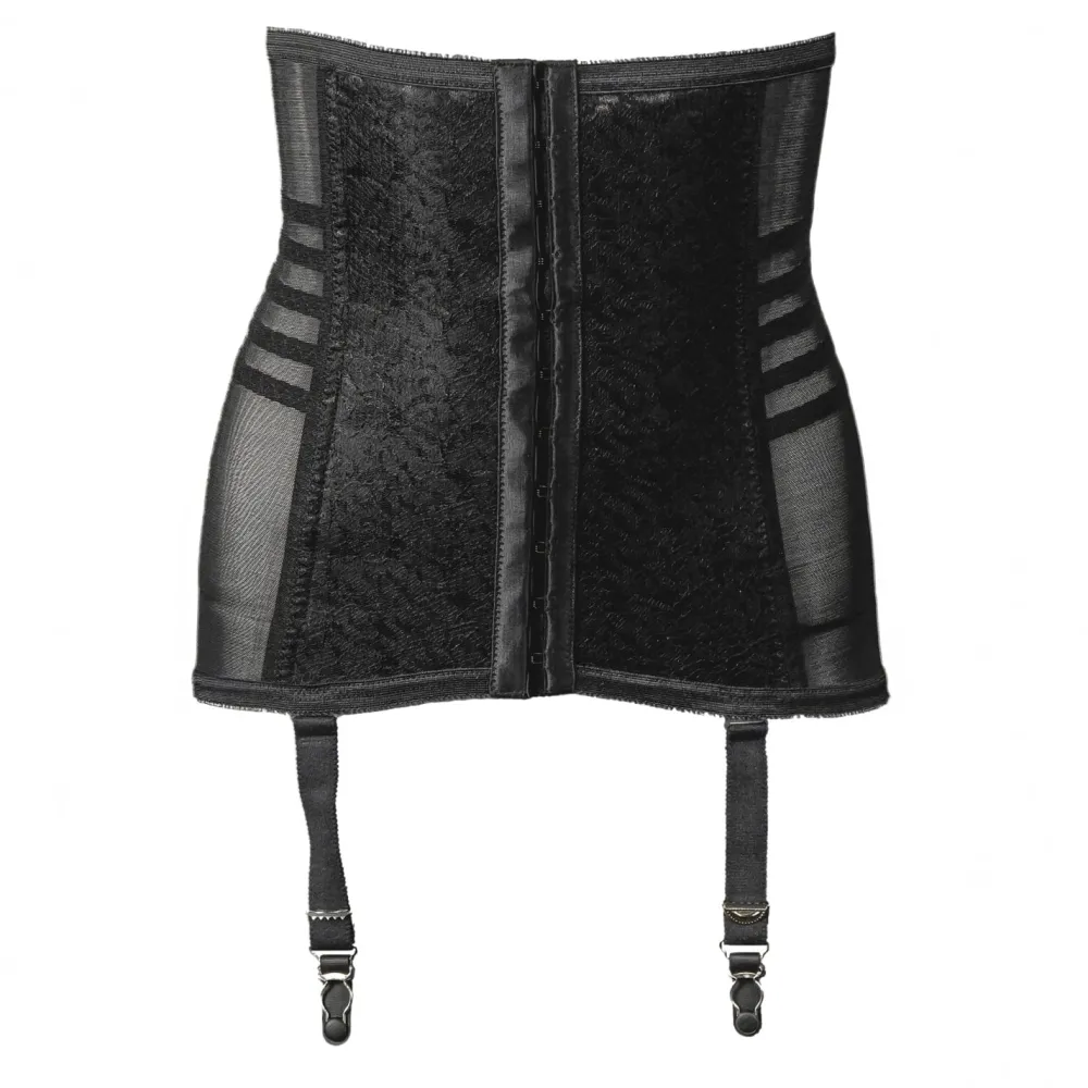 This waist training girdle with garters is made of firm control Power Net fabric made of 77% nylon, 23% Invista® Lycra® to stretch 2 ways.Features exclusive contour bands and spiral boning for back support.