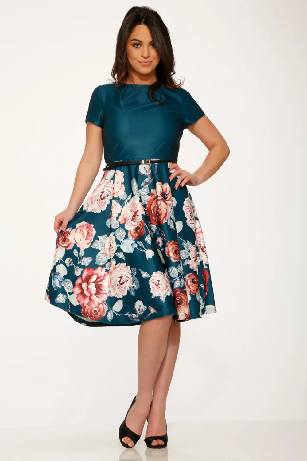 Effortlessly chic, the Orchid Bloom Teal Comcast Floral Dress brings a fresh and modern update to the vintage-inspired look. The sleek teal bodice pairs beautifully with the lush rose-printed skirt, creating a vibrant contrast that’s as eye-catching as it is sophisticated. The soft stretch fabric and flattering A-line silhouette ensure comfort and elegance for any occasion, while the center back zipper makes dressing a breeze.