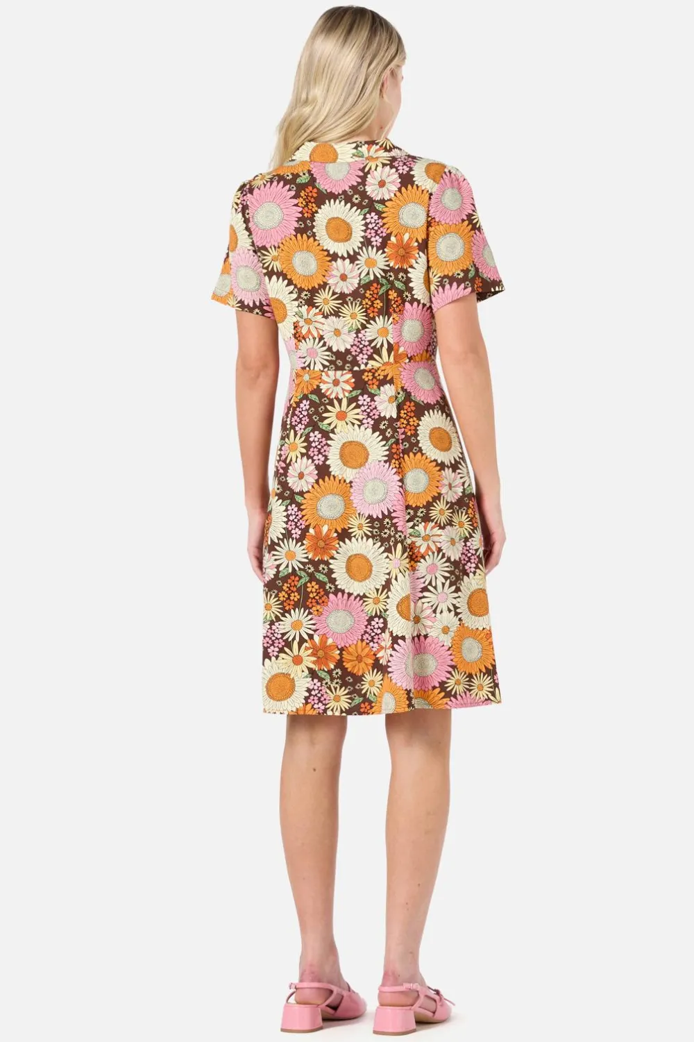 Channel your inner flower child with the Viva Floral Shirt Dress by Princess Highway. Inspired by 70s style icons, this retro floral midi dress radiates groovy charm with its warm palette of pink, orange, and chocolate. A smooth viscose fabric drapes beautifully in a fit-to-flare silhouette, perfect for festivals, market strolls, or spontaneous road trips.