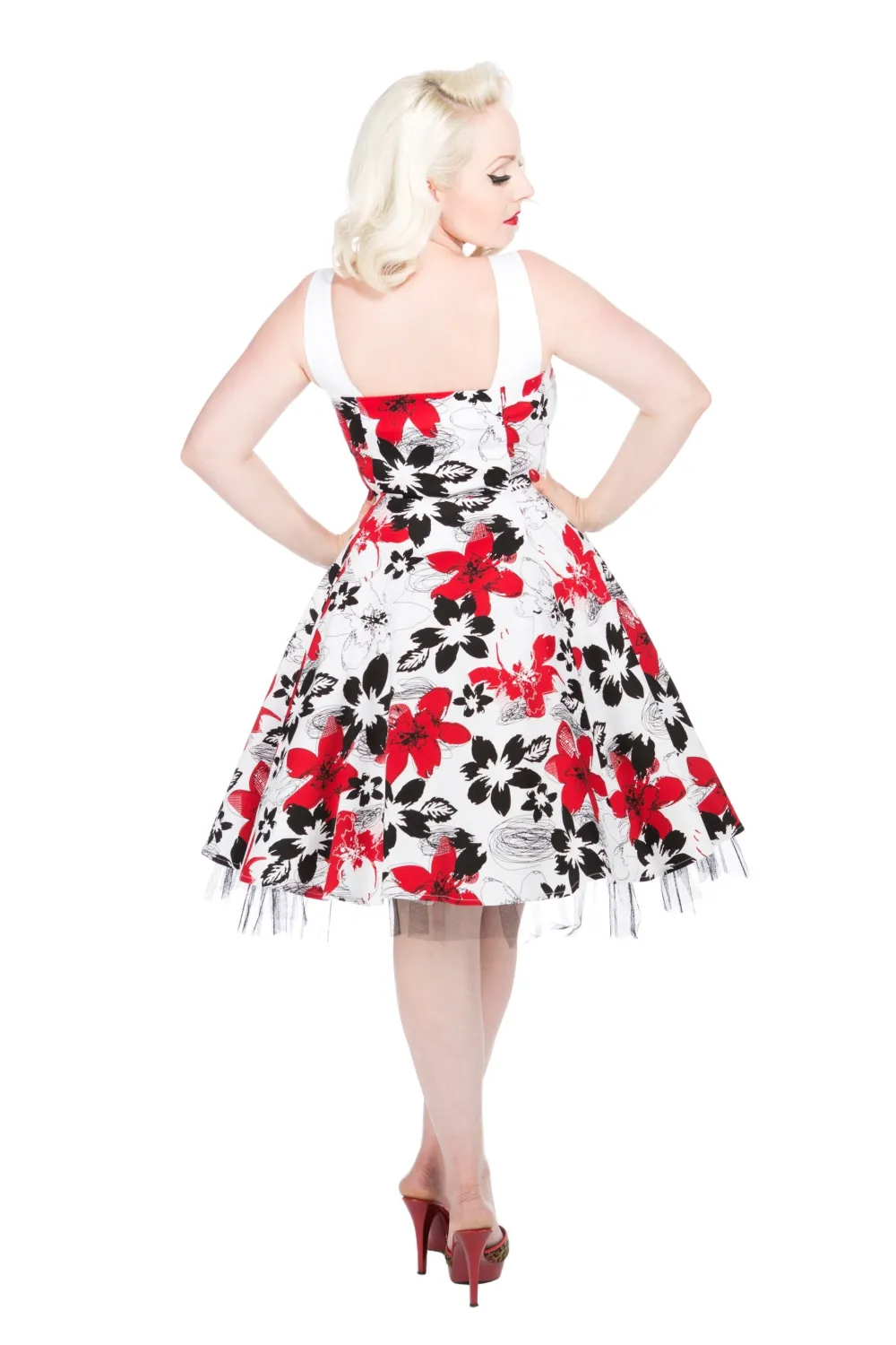 Bring a pop of retro-inspired romance to your wardrobe with the Orchid Bloom White & Red Floral Swing Dress. Bursting with vibrant red and black florals against a crisp white background, this dress is both striking and playful. The classic swing silhouette is crafted from a comfortable cotton-spandex blend that moves effortlessly with you, while the side zipper ensures easy wear. Perfect for summer picnics, garden parties, or just brightening your day!