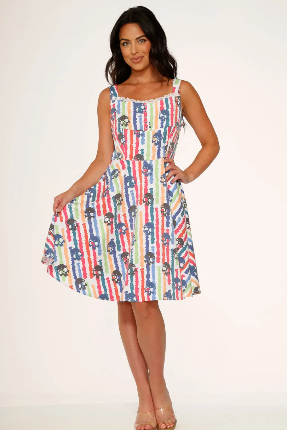 Bring bold energy and a splash of color to your twirl with the Orchid Bloom White Skulls Rainbow Swing Dress! Featuring a playful print of vibrant rainbow skulls against a crisp white backdrop, this retro-inspired fit-and-flare is a perfect mix of sweet and rebellious. Crafted from a comfy cotton-spandex blend, it’s ready for sunshine, smiles, and making a statement wherever you go.