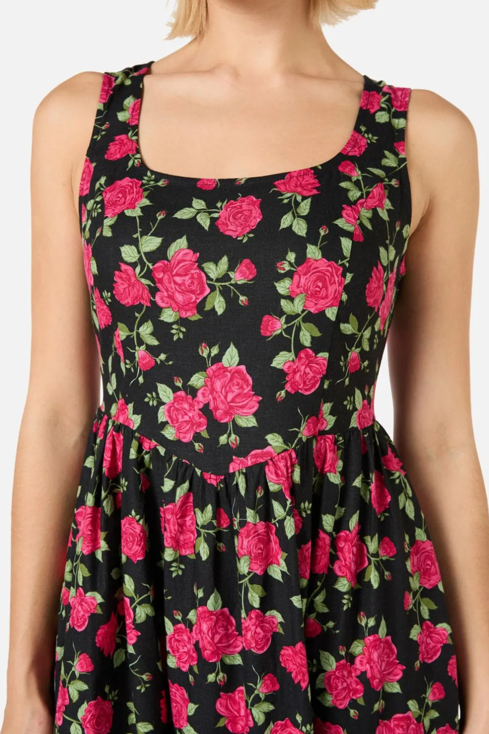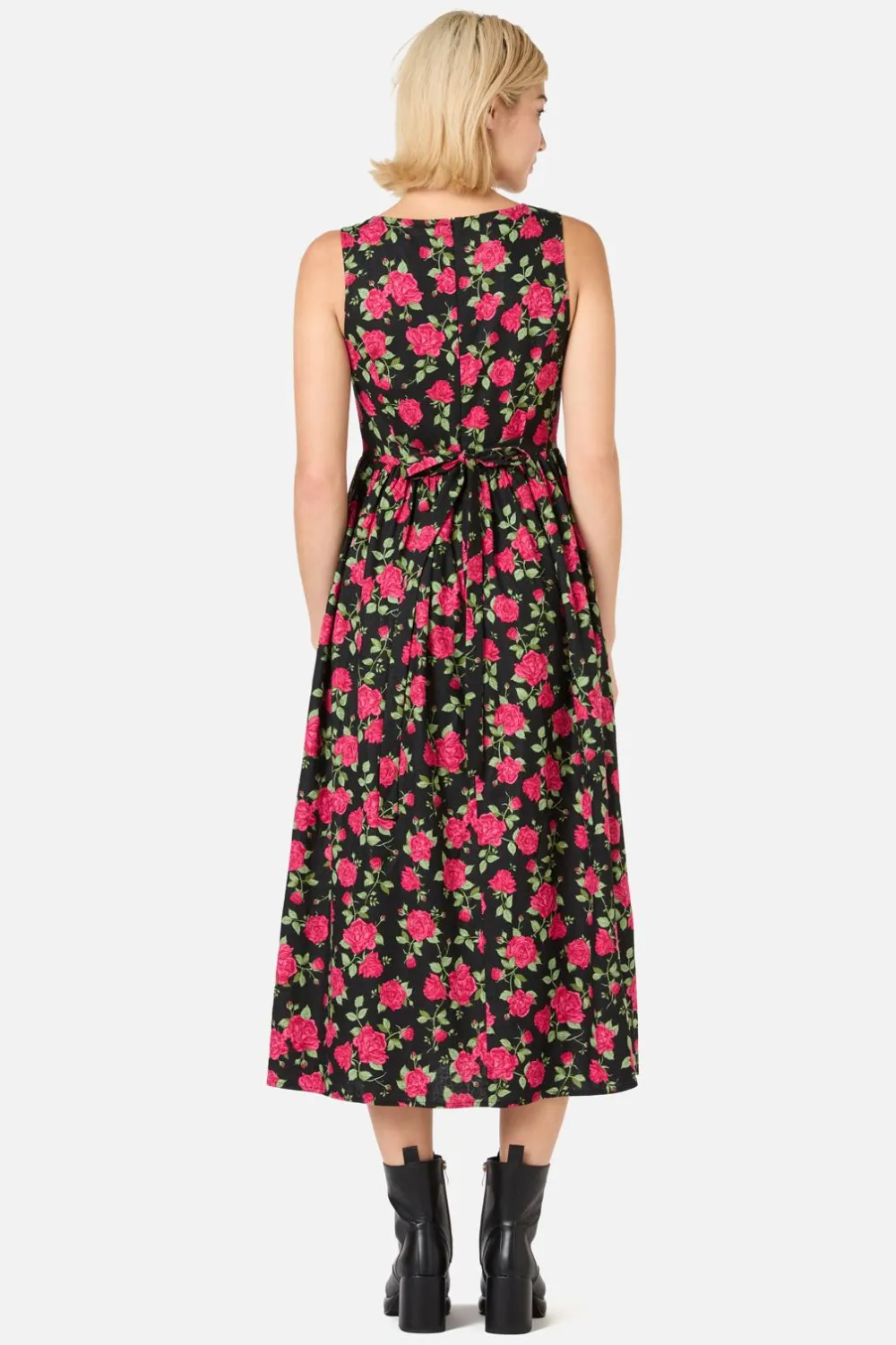 Channel 90s romance with the Winter Rose Midi Dress by Princess Highway. This sleeveless midi dress is perfect for layering and features a delicate red rose print on a soft pink base. Designed with a fitted bodice, scooped neckline, and a gentle V-shaped waistline that flows into a gathered skirt, it’s a timeless silhouette with feminine charm.