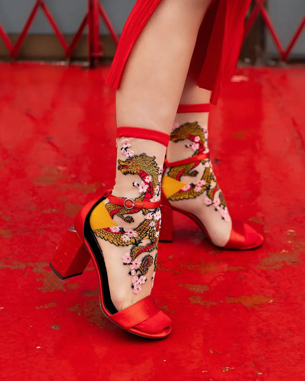Celebrate Lunar New Year with our stunning Year of the Dragon sock, paying homage to our Founder’s heritage. Two gold and red dragons mirror each other and intertwine, creating perfect symmetry from the front view and a full dragon from the side view. Cherry blossoms give this sheer dragon sock a feminine and unexpected touch. Pair with red shoes and wear all February, from Chinese New Year to Valentine’s Day.