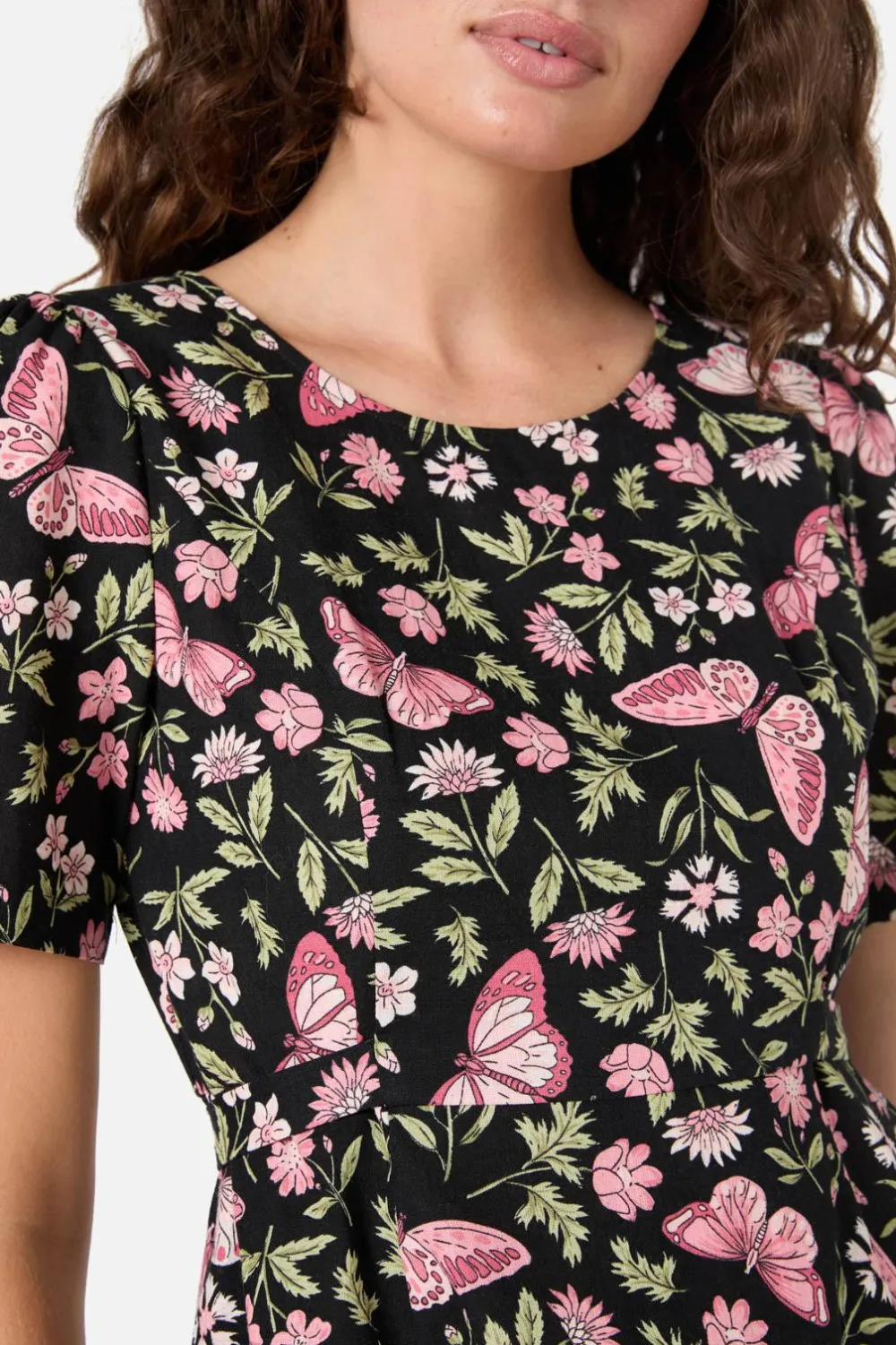 Feminine and full of flutter, the Yvette Butterfly Mini Dress by Princess Highway is your go-to for sweet, vintage-inspired charm. With a black base scattered in soft pink butterflies and florals, it’s a little garden party in dress form.