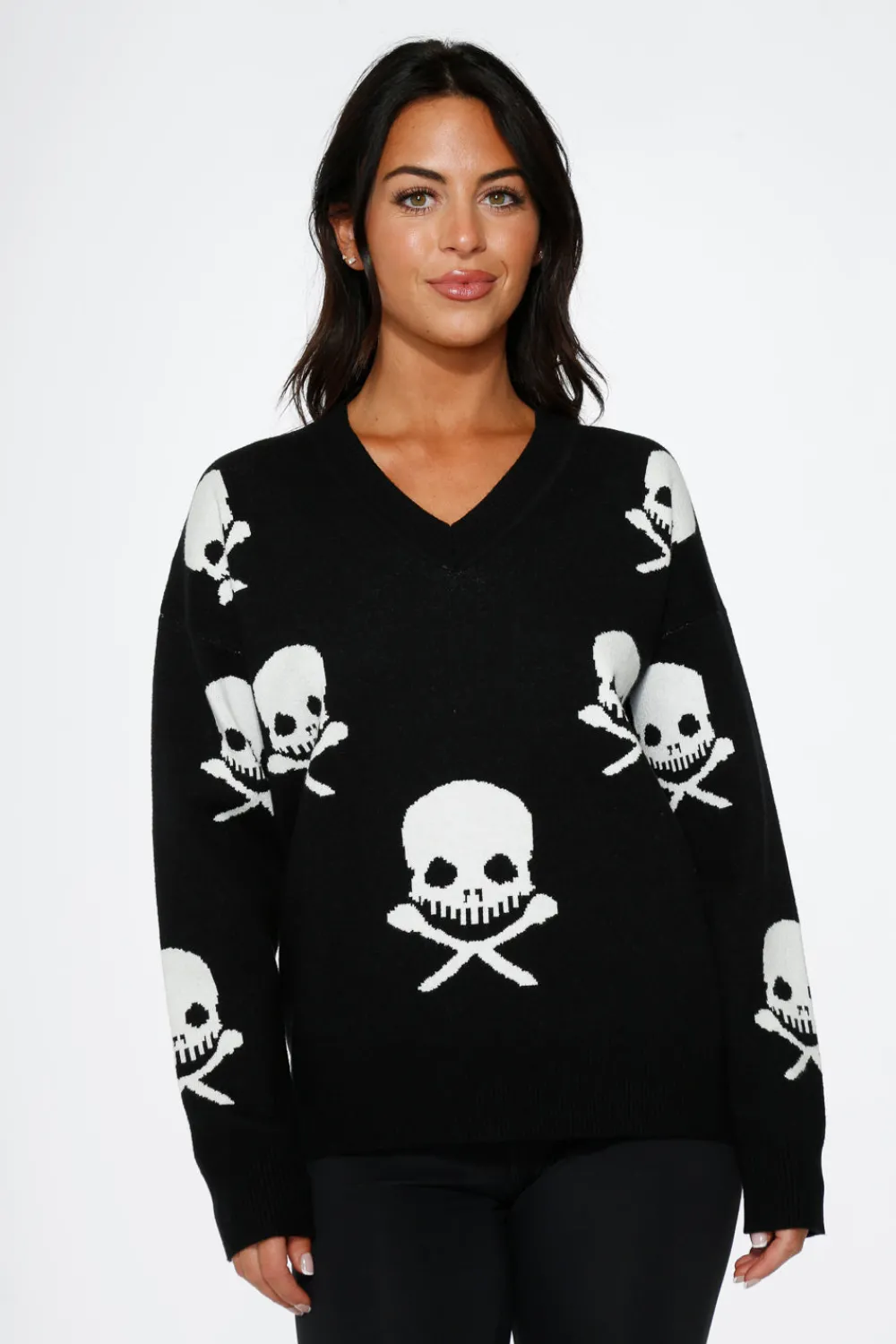Add a little edge to your cozy with the Orchid Bloom Black Skulls Sweater! Featuring a bold allover skull print and crafted from a soft, stretchy blend, this sweater brings a playful dose of rebel spirit to your everyday look. Perfect for layering over dresses or pairing with your favorite jeans, it’s comfy, cool, and made for standing out.