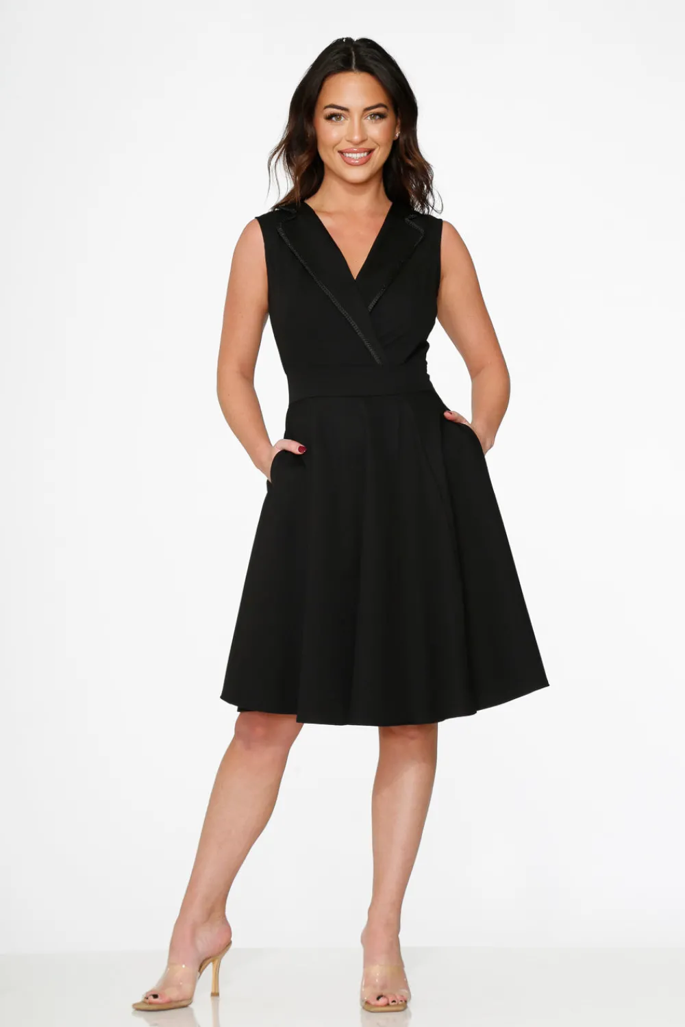 Crafted from a smooth polyester-spandex blend, it offers gentle stretch for all-day comfort. Designed with a center back zipper and functional side pockets, it’s the ideal mix of style and practicality.