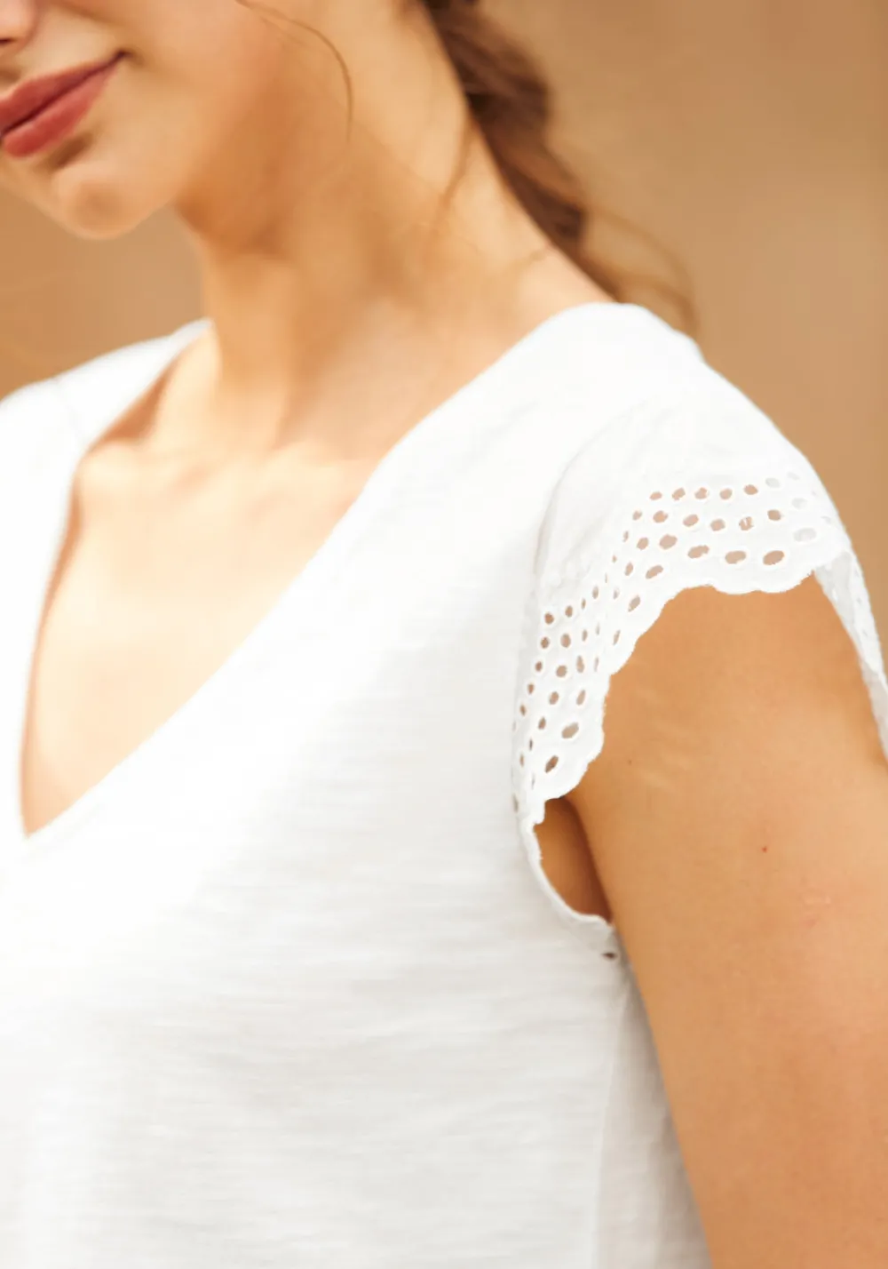 Dive into a whimsical world with this playful white v-neck top from our ModCloth namesake label. Crafted with soft, knitted fabric, this shirt is a breath of fresh air with its delicate lace cap sleeves adding a touch of fanciful charm. Its light and airy design promise both comfort and a superb fit, creating an effortless silhouette that’s as versatile as it is beautiful. Perfect for a sunny day out or a casual brunch with friends, this top pairs splendidly with your favorite jeans or a flirty skirt.