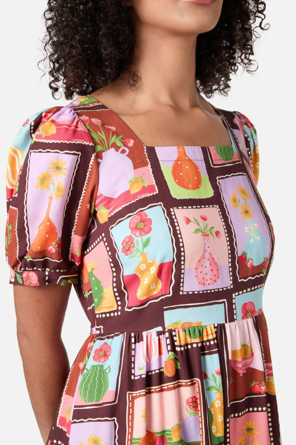 Embrace timeless charm with the Flower Vases Midi Dress by Princess Highway. Featuring a hand-painted print of colorful vintage vases, garden flowers, and fruits, this square-neck midi dress is made for sunlit strolls and carefree moments.
