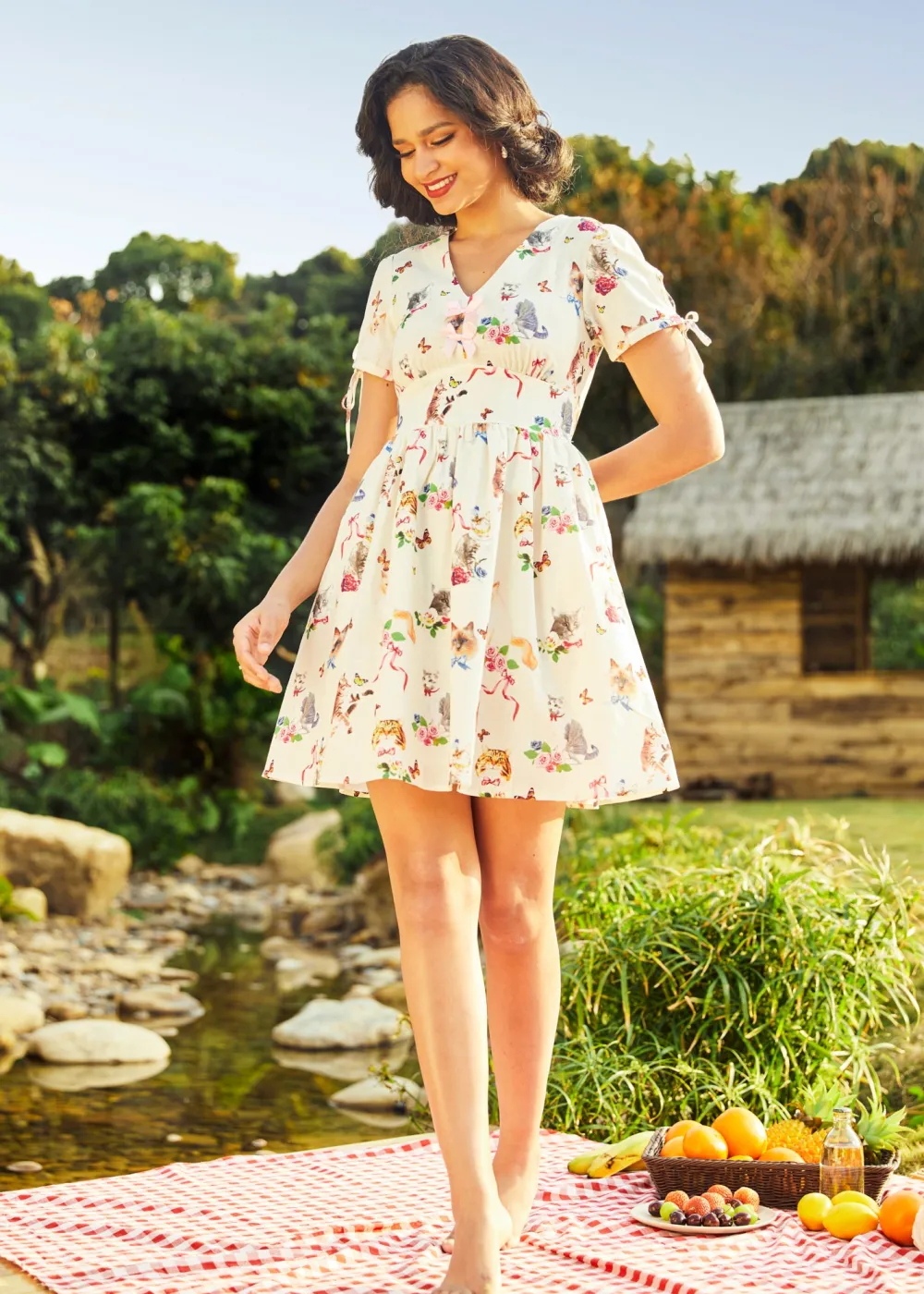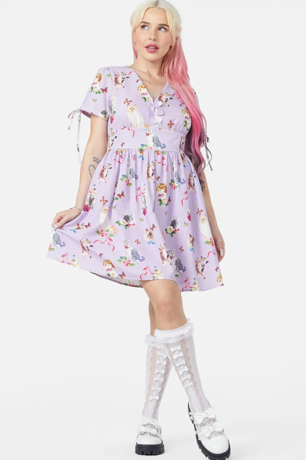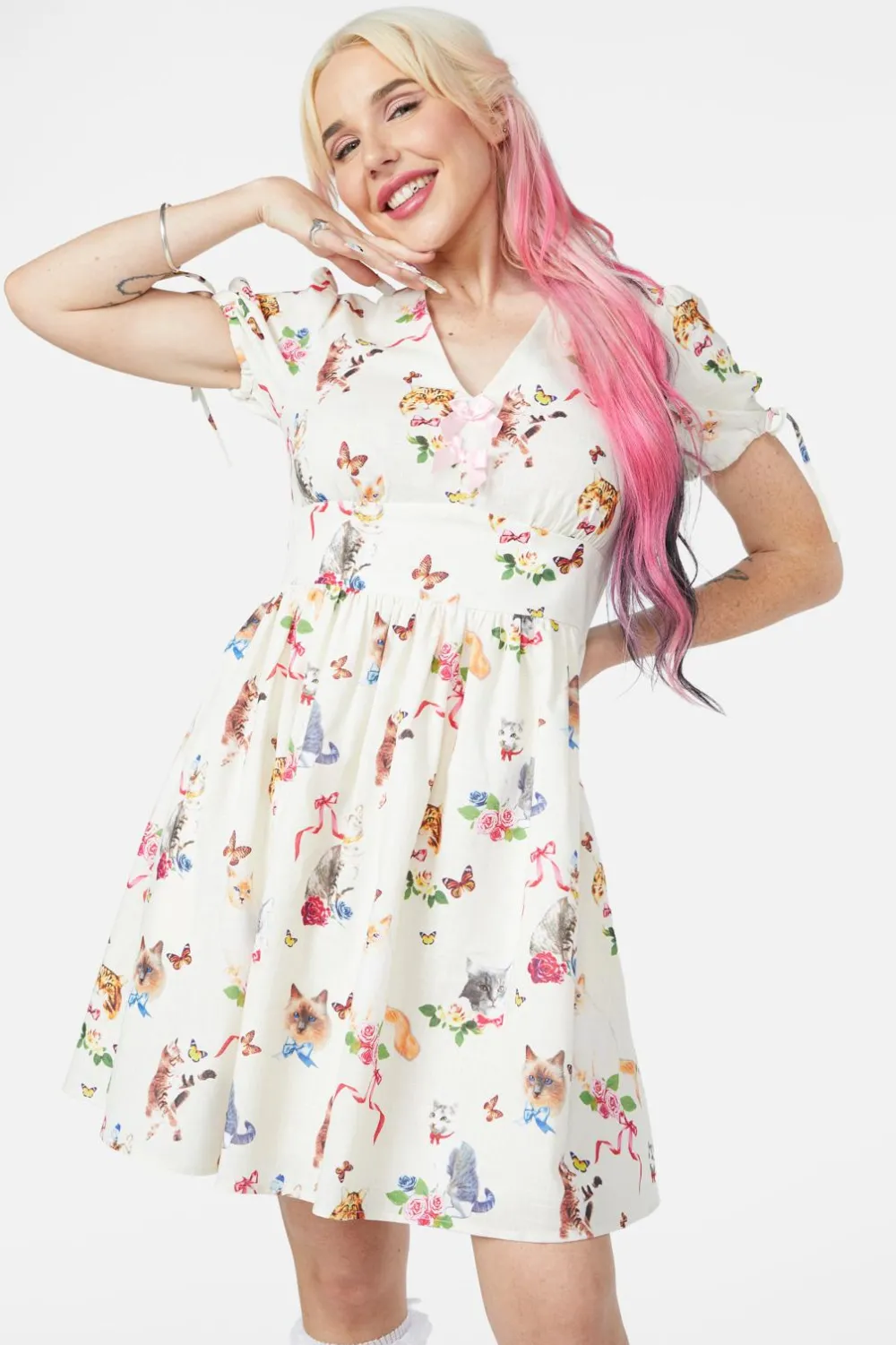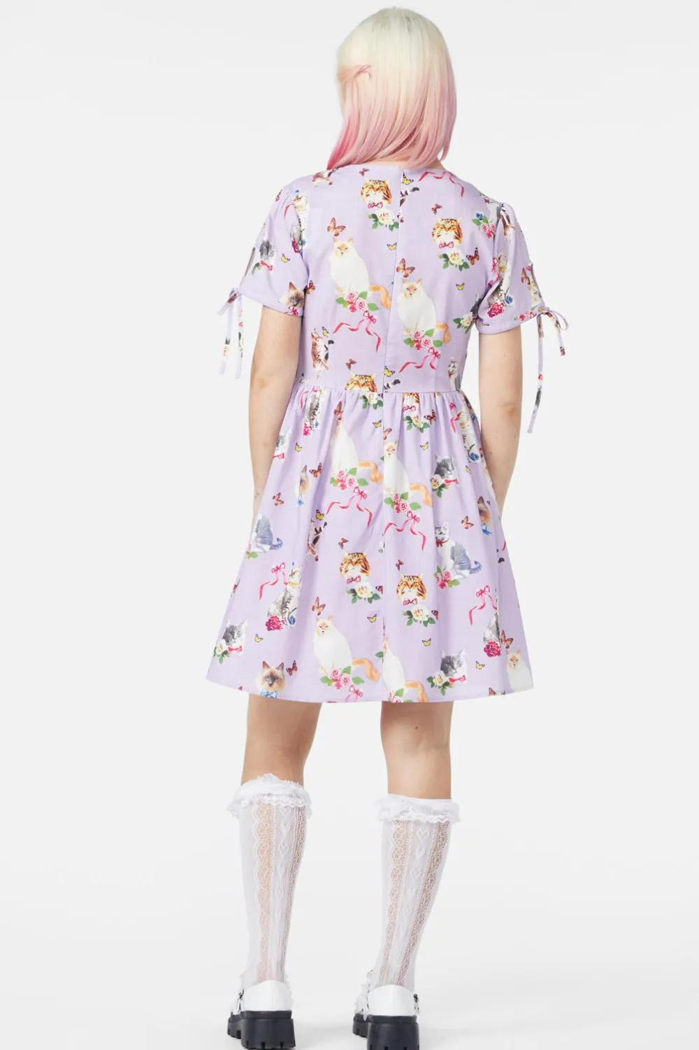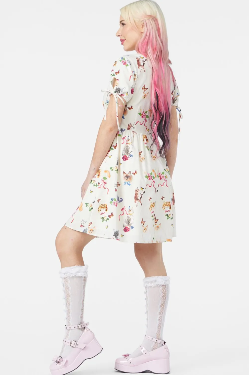Step into a whimsical wonderland with the Kitsch Kitty Print Dress—a perfectly playful piece bursting with vintage charm!