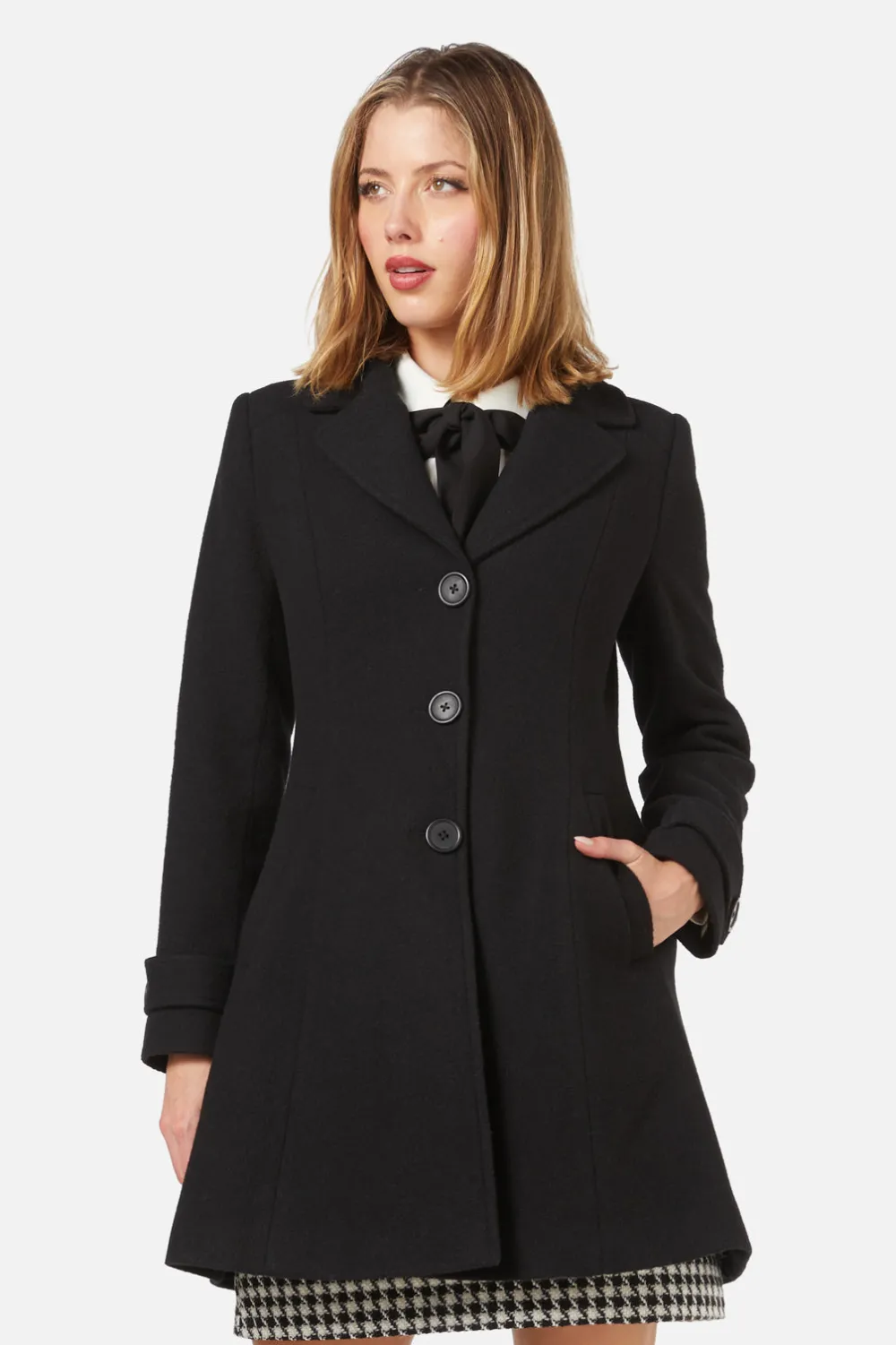 Step into winter elegance with the Mabel Coat, a classic fit-and-flare design that combines timeless style with cozy warmth. Featuring a wide lapel collar and semi-fitted bodice, this coat accentuates the waist for a flattering silhouette while the A-line shaping adds graceful movement. The button front and fully lined interior make it both functional and stylish, perfect for staying warm on chilly days.