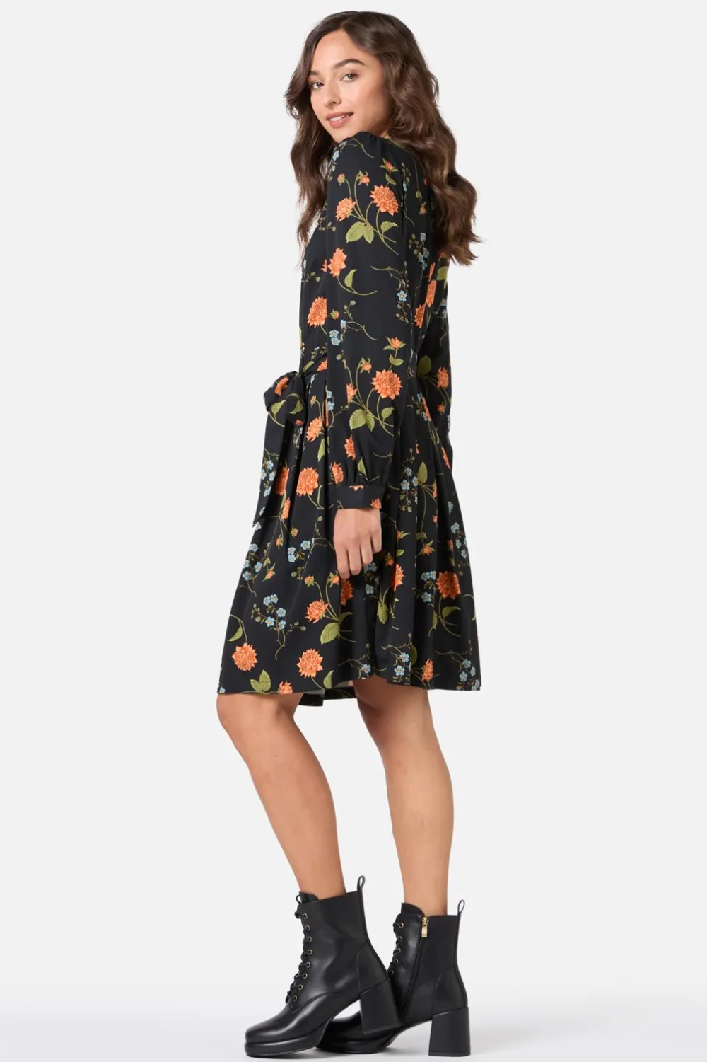 Step into 70s glamour with the Esmerelda Floral Mini Dress by Princess Highway. This black long-sleeve mini is adorned with a dreamy, flowing floral print that channels romance, elegance, and a touch of retro mystique. The semi-fitted bodice and soft pleated skirt create a flattering silhouette, while the detachable waist tie lets you cinch things up or keep it relaxed.