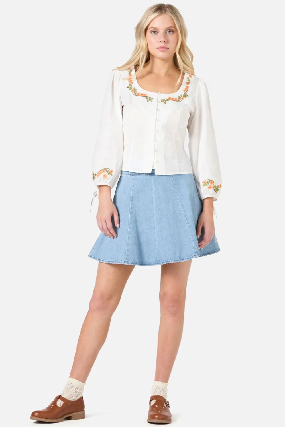 A vintage-inspired fitted top with a square neckline and retro 70s flower embroidery, perfect for a charming, bohemian look.
