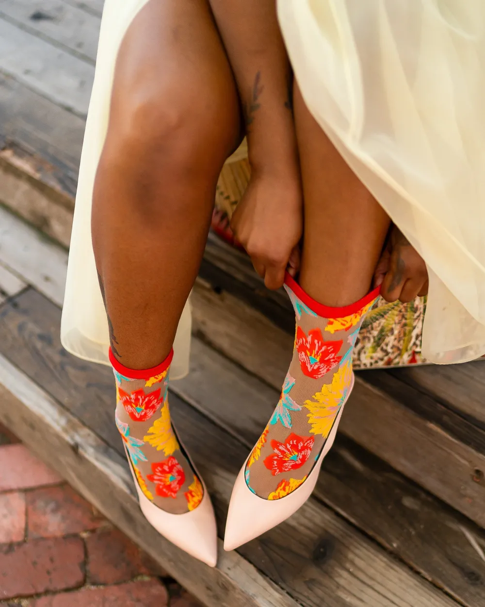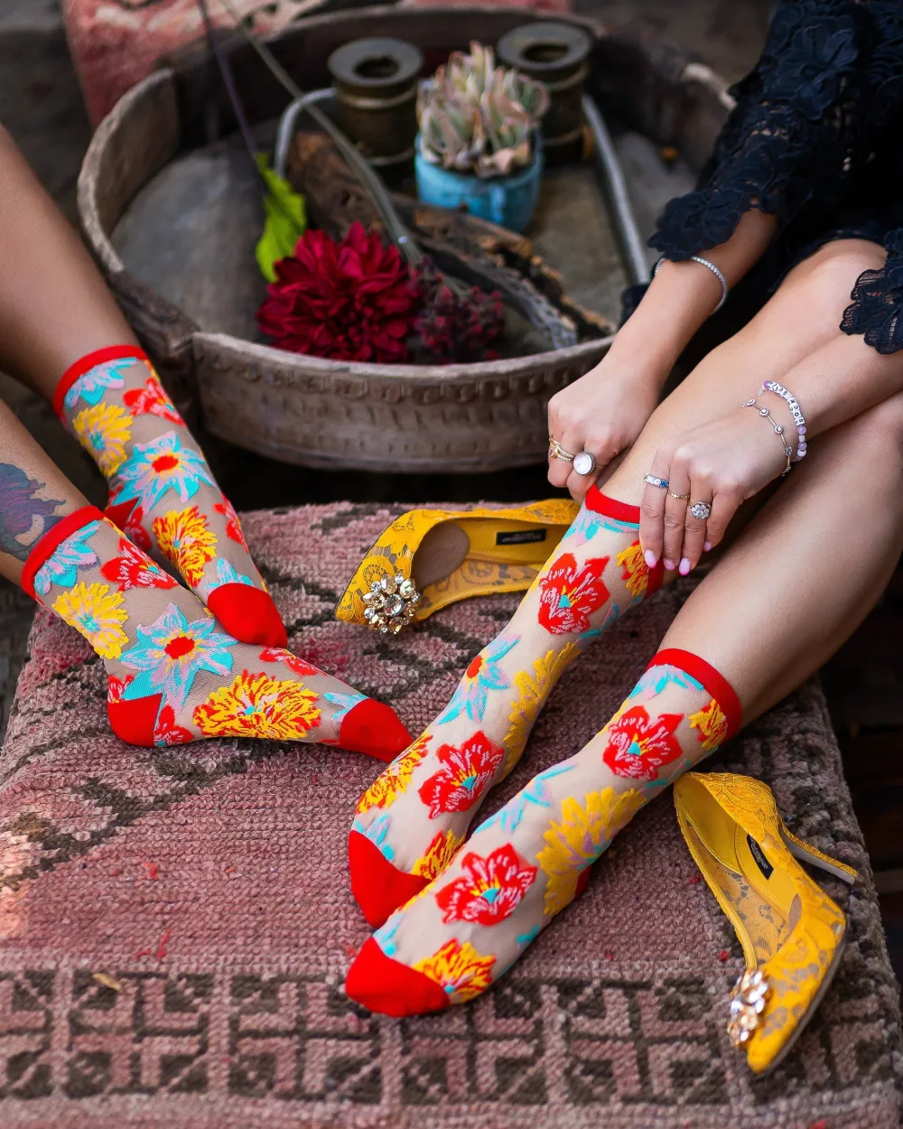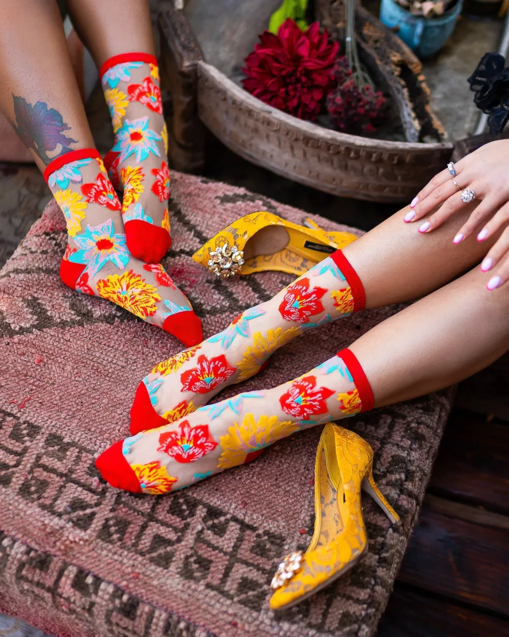 Not for the faint of heart, our Flower Power sheer sock is bold and bright. Vivid orange-red, sunny yellow, and striking aquamarine flowers burst against a sheer backdrop, creating the perfect harmony of funky and elegant. A soft pink accent adds an unexpected twist, making this sock a true conversation starter.