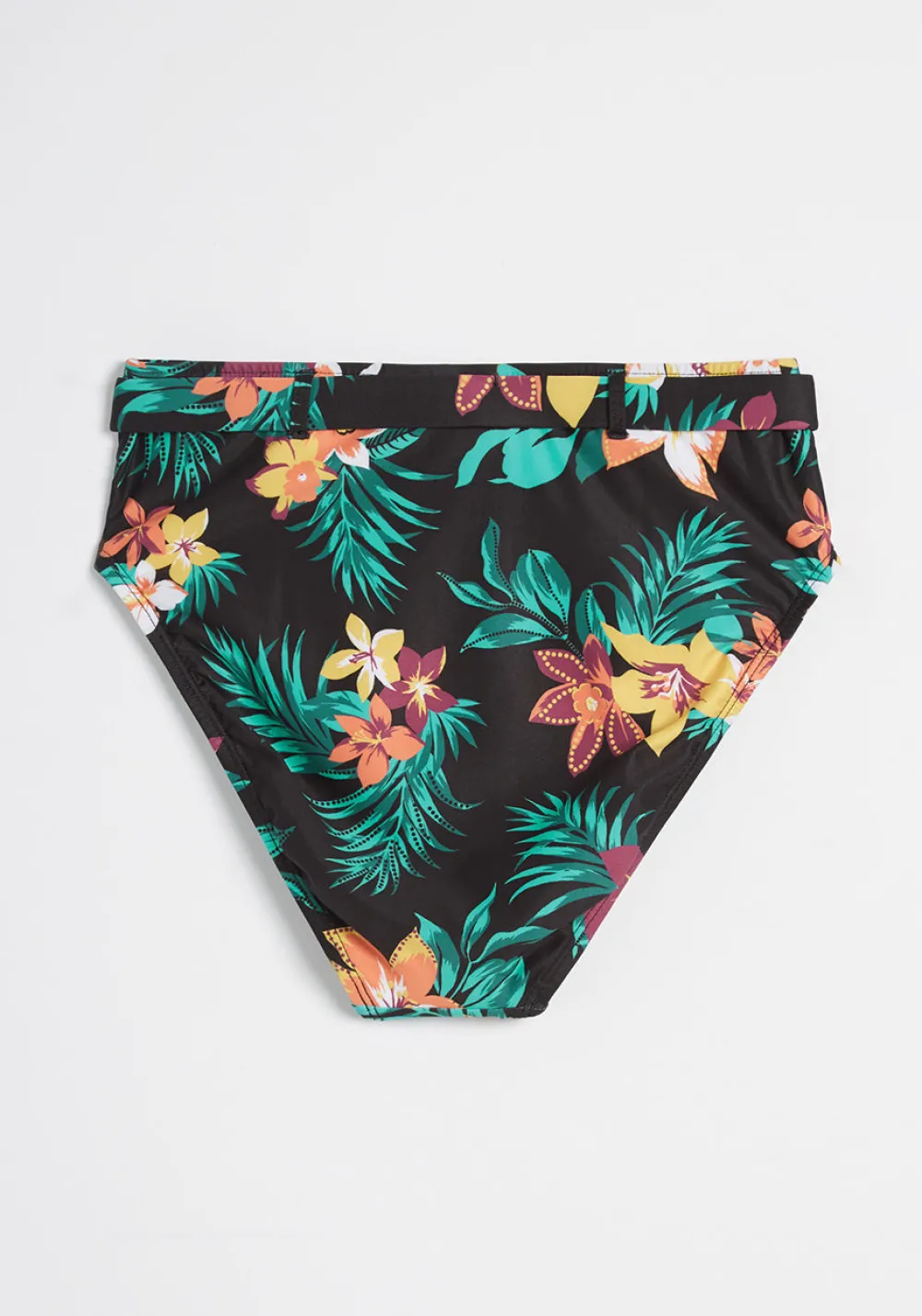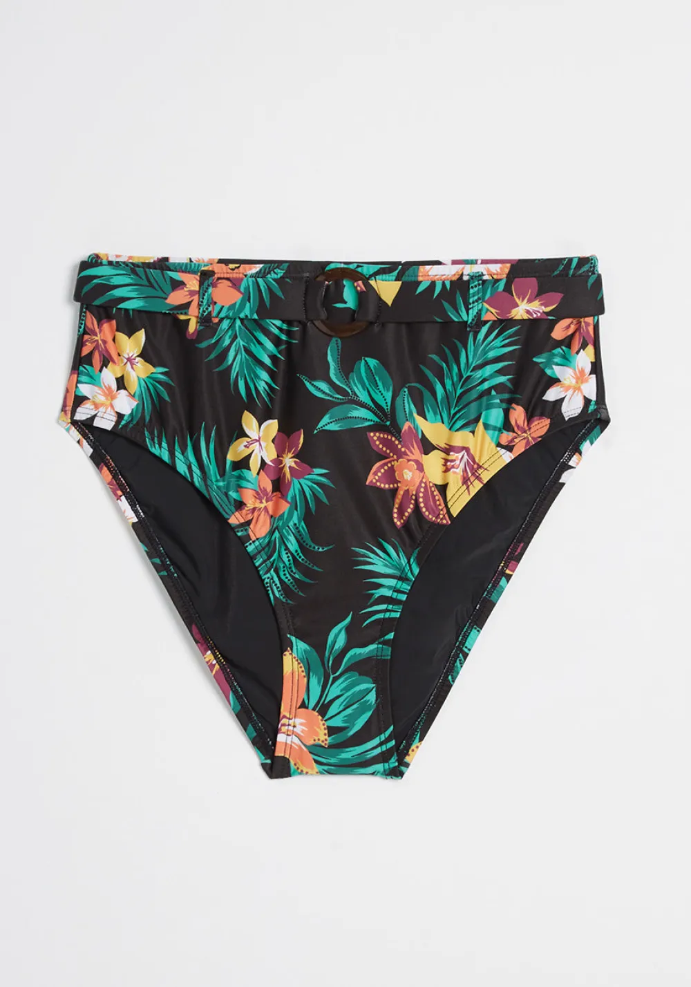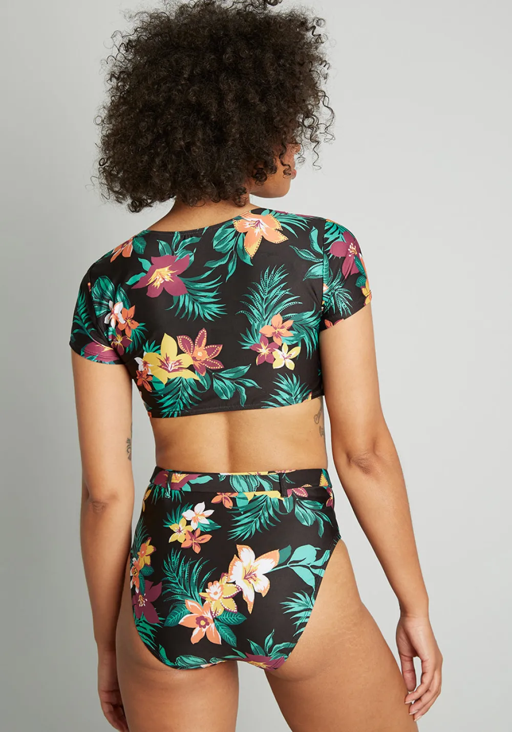 Hey, doll. Add a splash of retro, tropical vibes to your swimwear rotation with these fab ModCloth namesake label bikini bottoms. With a high-waist, high-cut leg, and an elasticized, attached belt with tortoiseshell ring at the center, this black swim bottom boasts a bold, vibrant tropical floral print made-up of green and teal leaves embedded with white, yellow, orange, and burgundy red flowers, which is designed to be mixed and matched with various bikini tops, including their matching top! A fun and flattering choice if you’re feeling like dressing up near any body of water.