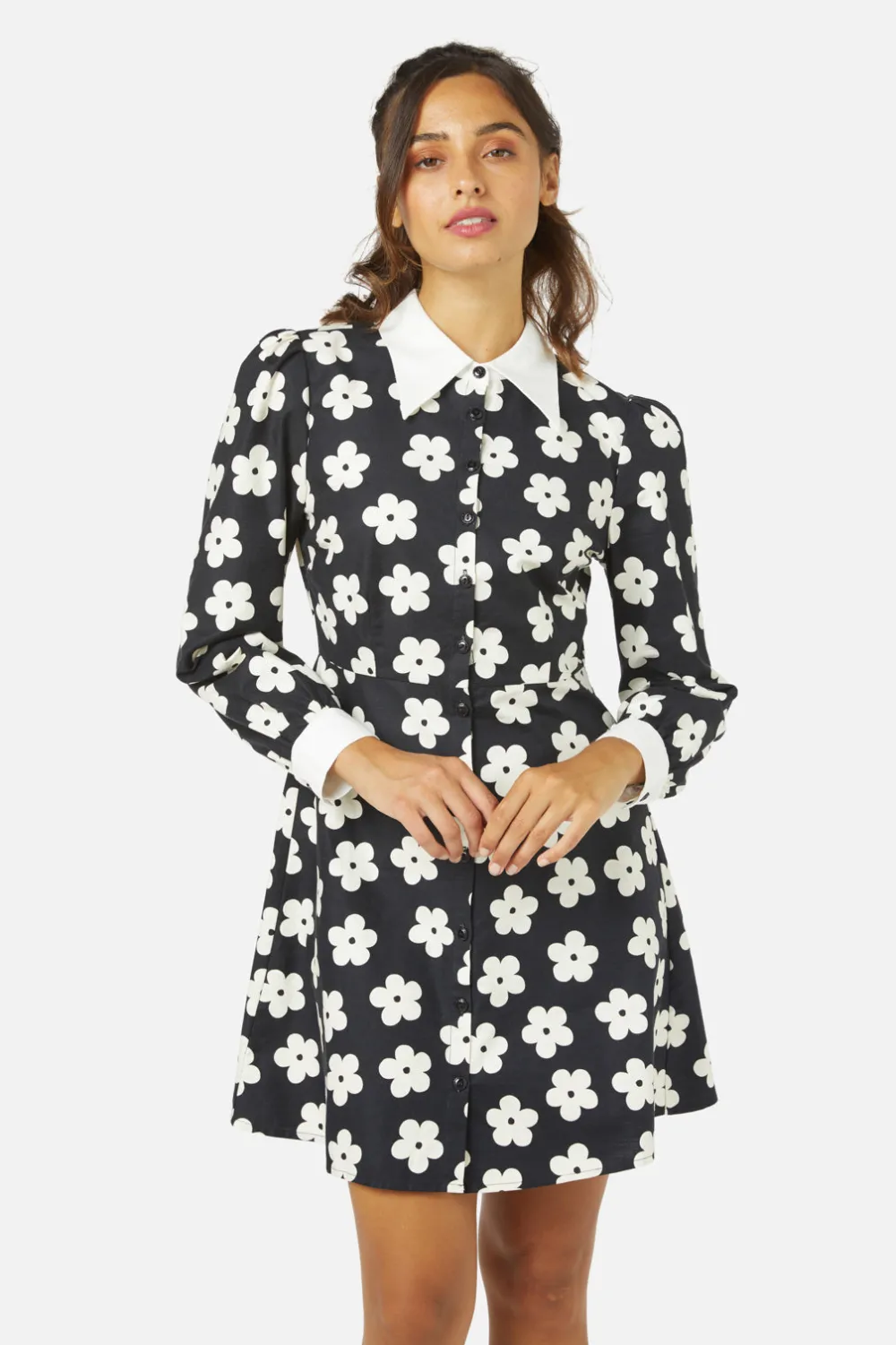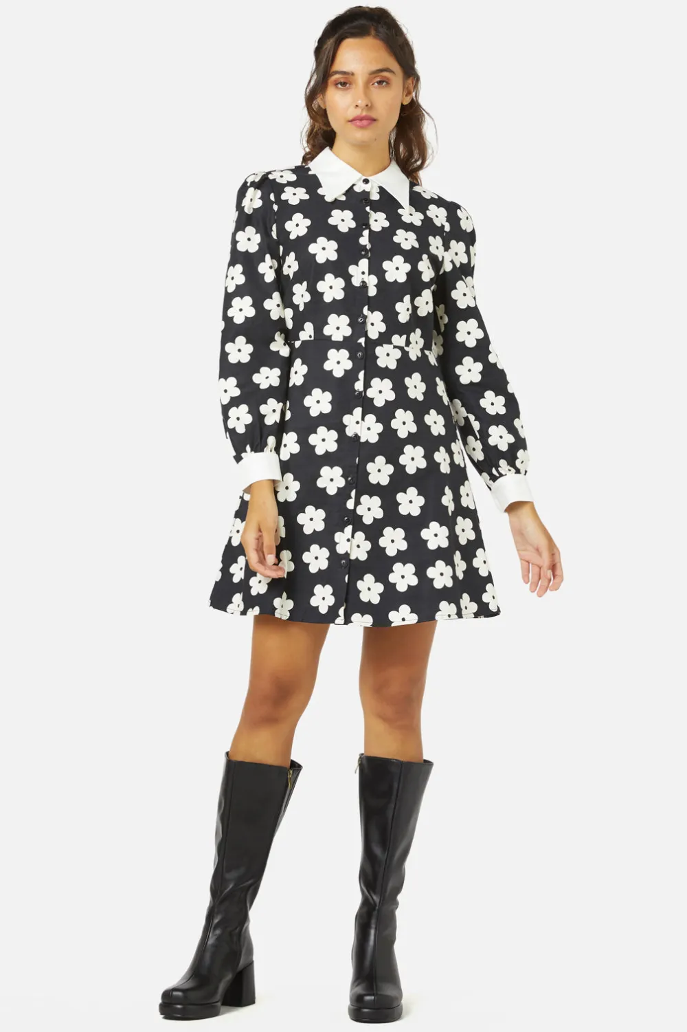 Step into a realm where fashion takes a playful leap back in time with the Daisy Shirt Dress by Princess Highway. Picture this: a design that captures the essence of the spirited ’60s, adorned with a minimalist daisy print that’s both adorable and unmistakably groovy. It’s not just a dress; it’s a statement of joy and nostalgia intertwined. The contrasting collar and cuffs add a snippet of surprise, framing the button-down front that traces elegantly down to a smartly fitted waist. Here, thoughtful darts at the bust and waist craft a silhouette that’s as flattering as it is comfortable. The dress then flares into an A-line skirt, recalling days of jaunty dances and uninhibited laughter. Long sleeves, accented with contrast-colored cuffs, complete the ensemble, offering a snug embrace. Available in a classic black that’s as versatile as it is timeless, this dress promises to be your go-to for whimsical weekend outings, quaint coffee shop encounters, or any day you wish to sprinkle a bit of fun and flair into.
