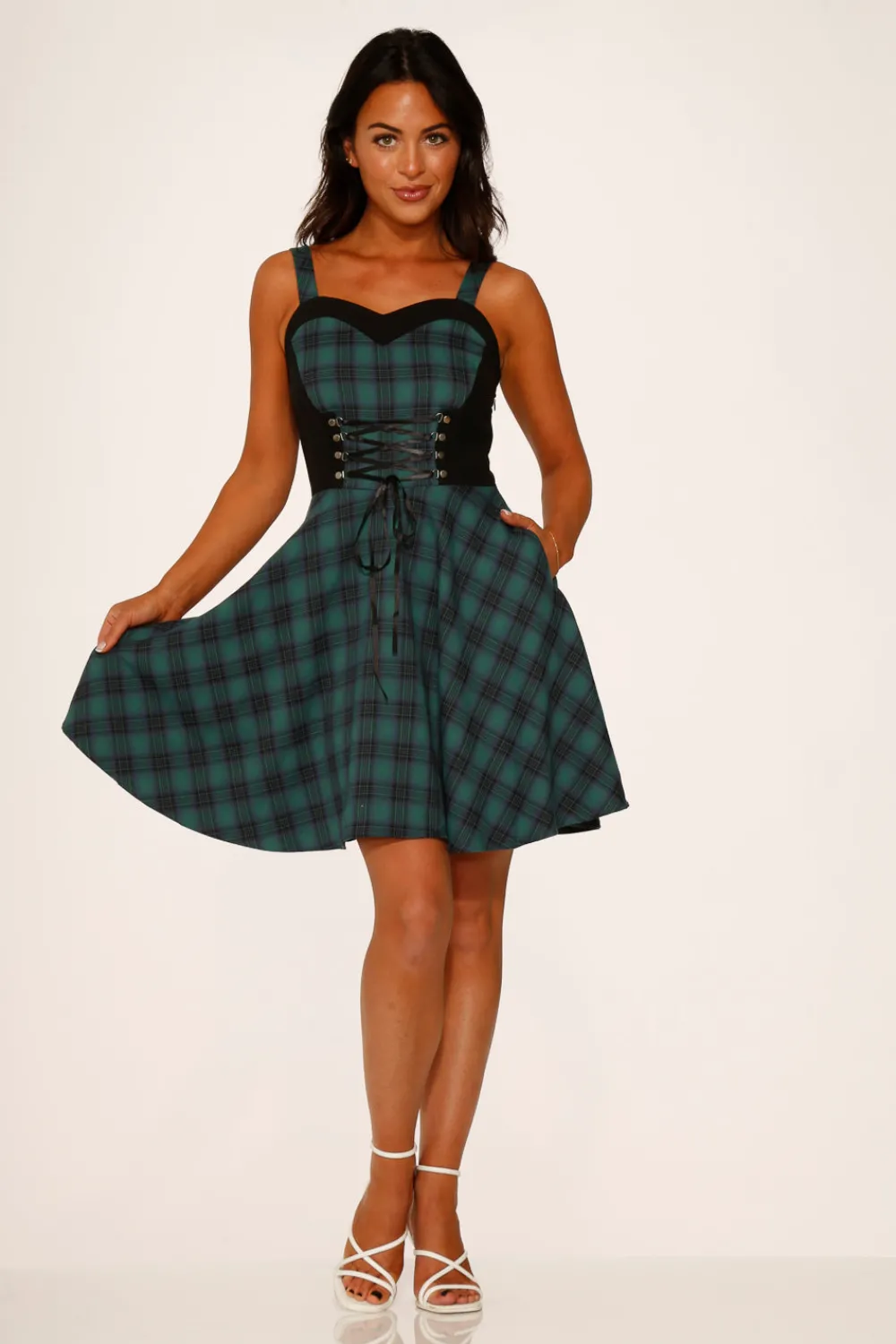 Channel a modern edge with a nod to classic style in the Orchid Bloom Green Plaid Swing Dress. Featuring a striking green and black plaid pattern, this dress combines timeless appeal with contemporary flair. The fitted bodice is accented with a lace-up corset front for a flattering, edgy silhouette, while the flared swing skirt adds playful movement. Crafted from a cotton-spandex blend for comfortable stretch and finished with a side zipper for easy wear.
