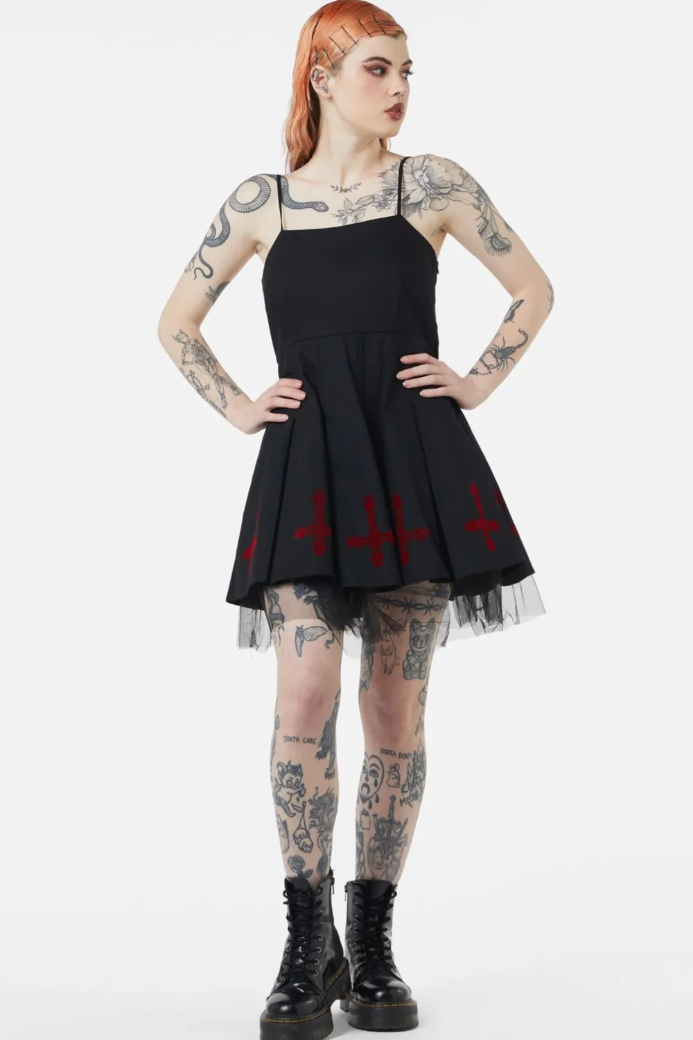 Embrace the charm of enchanted evenings in the Bustier Style Dress from Dangerfield, a cotton confection that marries mischief with a dash of midnight magic. This dress captivates with a fit and flare silhouette, cinching at the waist and blossoming into a frolic of tulle skirt layers that add just the right amount of volume for a fairy-tale twirl. An elasticated sheered back panel ensures the kind of comfort that could easily see you from a spontaneous tea party to a moonlit waltz in the garden. The ‘Hail Lilith’ flocked artwork whispers of mystical tales and legendary dames, adding a whisper of intrigue to the classic black fabric. Whether you’re sipping cider at a harvest festival or casting spells at a local soiree, this dress is an ode to the spirited and the spellbinding – a true delight for any wardrobe wanderer.